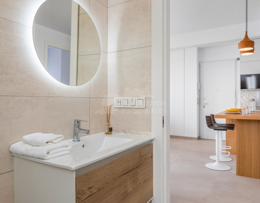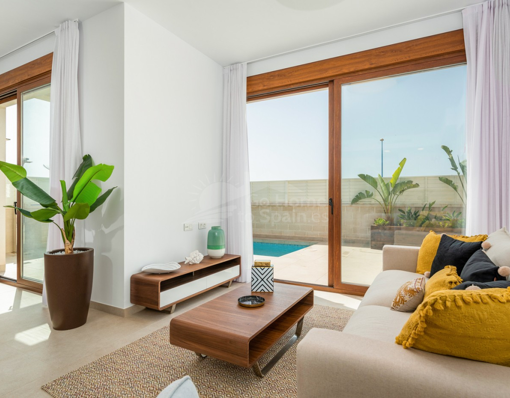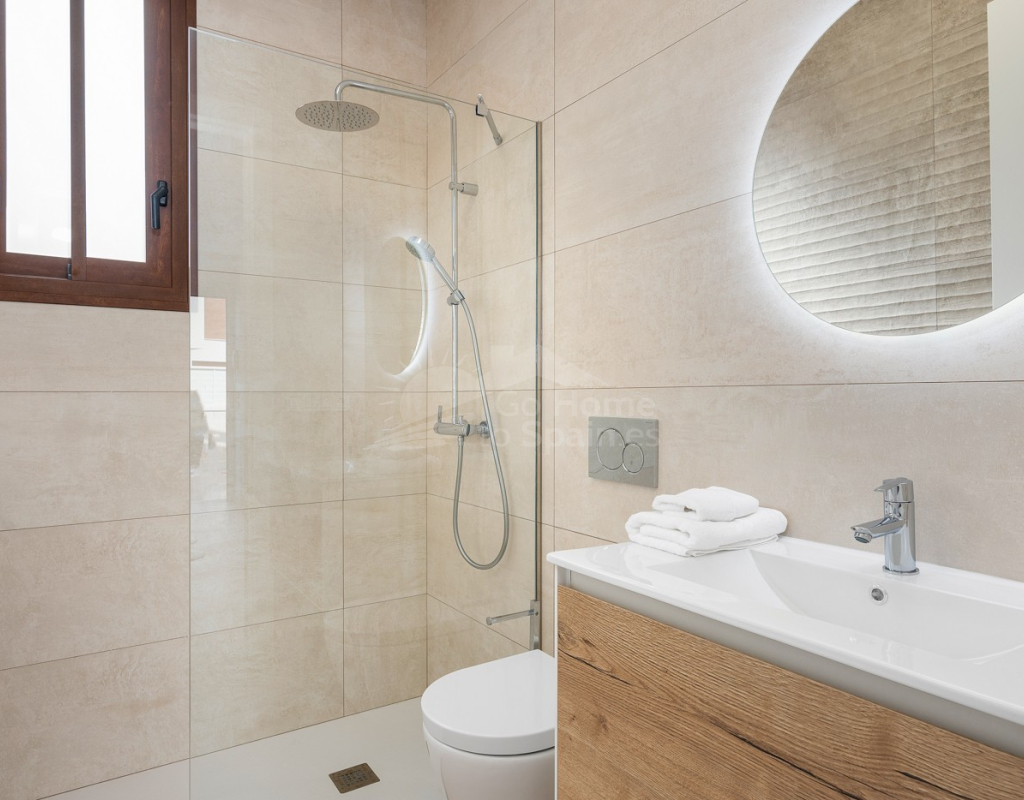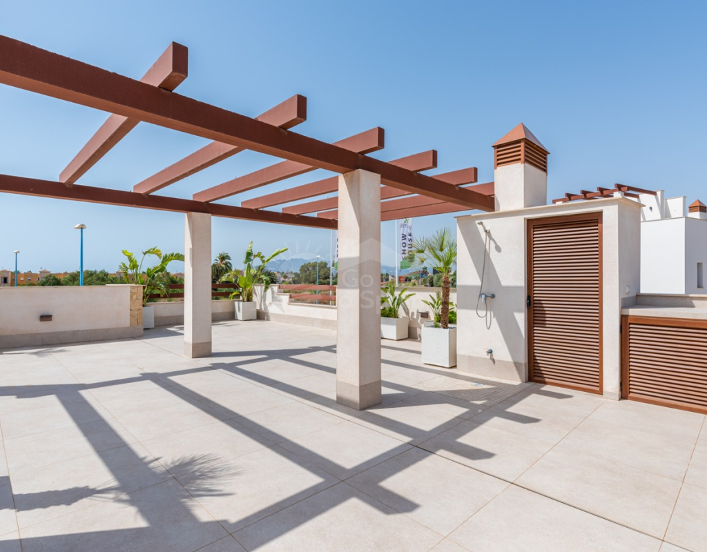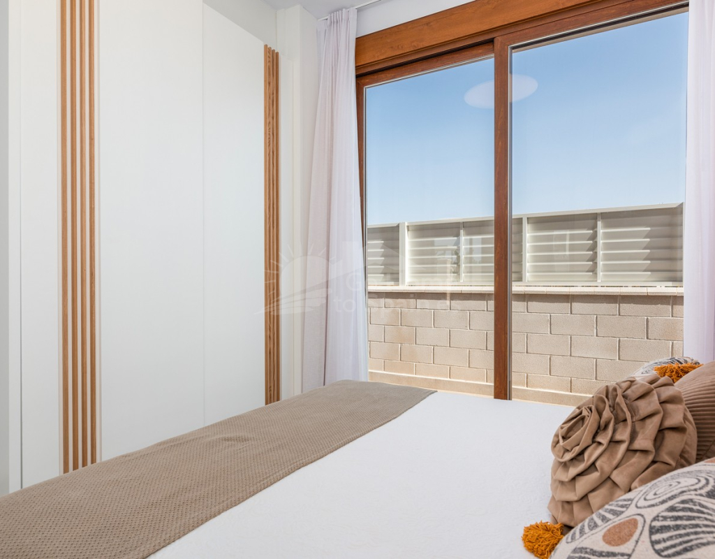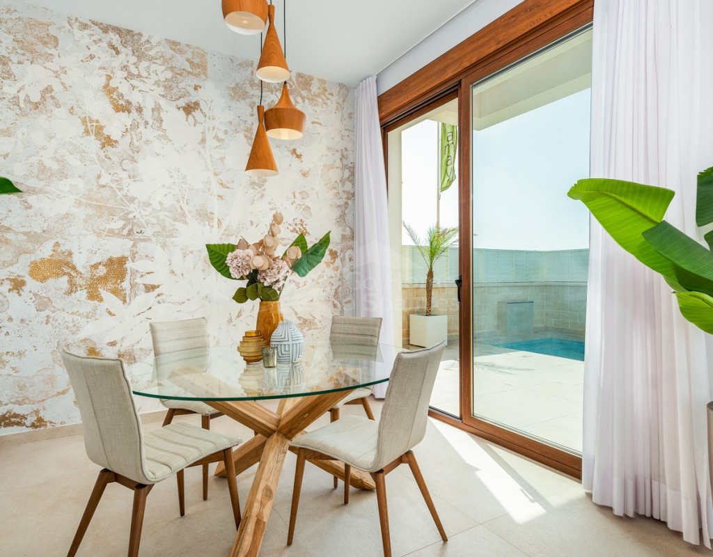 Villa de obra nueva en venta en Vera, Almería En esta preciosa villa de obra nueva en Almería se respira mar, calidez, pero sobre todo fantasía. Está situada a tan solo 200 metros de una hermosa playa de arena suave y aguas cristalinas, una de las más bonitas de Vera, donde los paseos al sol se convierten en una costumbre muy saludable durante todo el año. Esta propiedad de nueva construcción en Vera es parte de un complejo residencial de 100 villas independientes conocido como Monte Carmelo Resort, un recinto de confort, elegancia y diseño a orillas del mar Mediterráneo. Esta moderna urbanización está dividida en dos: Laguna Azul, viviendas de doble altura y Modelo Estrella, de una sola planta. Esta vivienda unifamiliar en concreto pertenece a esta última, sacando a relucir su encantador diseño mediterráneo con zócalos en madera, acabados en piedra natural y un revestimiento en monocapa blanco, ofreciendo mayor luminosidad y lucidez al conjunto de la propiedad. Todas ellas disponen de una parcela privada con piscina de 6 x 3 metros con luces de colores y cascada, terraza - jardín y un gran solárium, donde podrás acomodar tu propia zona chill out con preinstalación de jacuzzi y cocina exterior. El lugar ideal para relajarte con una buena copa mientras tomas los rayos de sol durante el día y por la noche, mientras contemplas las estrellas en silencio. La propiedad perfecta para una vida mejor en España Todos en algún momento necesitamos un lugar donde desconectar, a poder ser un lugar con buen clima y buenas playas. Y es justo lo que esta propiedad ofrece: una vida de vacaciones con sol, a un paso de las mejores playas naturistas y una multitud de servicios, a escasos 10 minutos del residencial, a los que podrás acceder fácilmente para que nada te falte en tu día a día. Te sorprenderá descubrir la calidad de los interiores de esta vivienda de 3 dormitorios y 2 baños. No pierdas detalle a su cocina moderna amueblada con bancada de silestone y luces LED, su salón comedor abierto con cristal de doble altura y sus mágicas habitaciones inundadas de una luz natural especial. Esta casa completamente nueva en la costa almeriense te robará el corazón. ¿Por qué no la descubres y te enamoras un poco más de su entorno y estilo? Piloto: Avenida Ciudad de Barcelona S/N, 04621 Vera Playa, Almería.