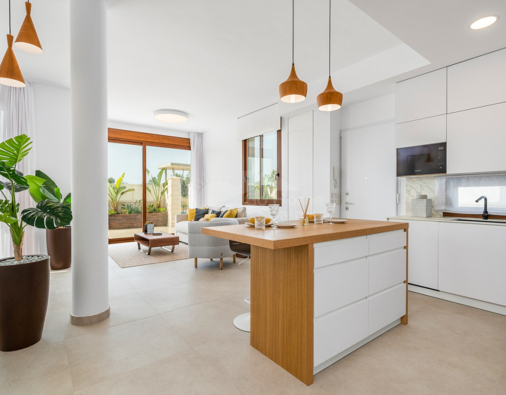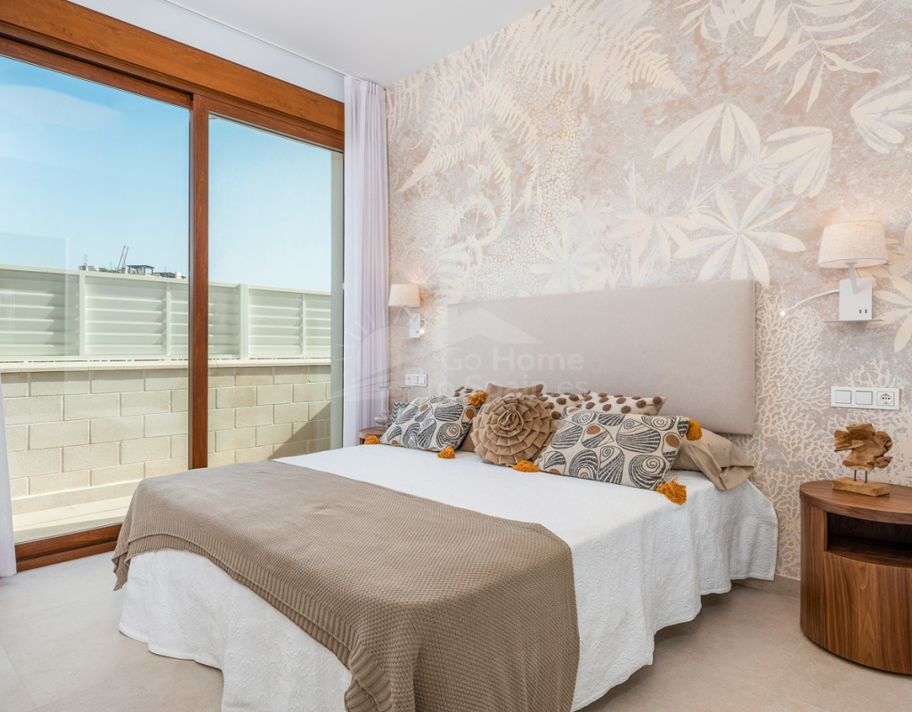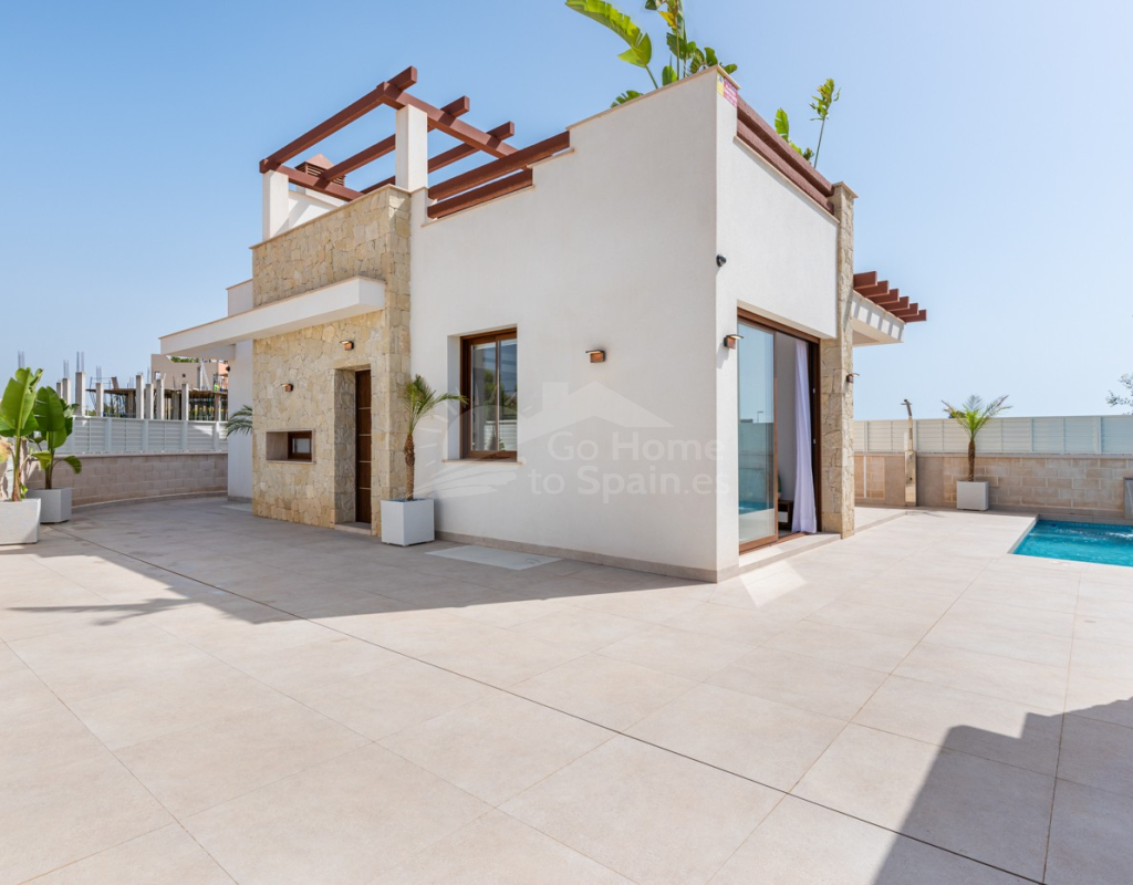 Villa de obra nueva en venta en Vera, Almería En esta preciosa villa de obra nueva en Almería se respira mar, calidez, pero sobre todo fantasía. Está situada a tan solo 200 metros de una hermosa playa de arena suave y aguas cristalinas, una de las más bonitas de Vera, donde los paseos al sol se convierten en una costumbre muy saludable durante todo el año. Esta propiedad de nueva construcción en Vera es parte de un complejo residencial de 100 villas independientes conocido como Monte Carmelo Resort, un recinto de confort, elegancia y diseño a orillas del mar Mediterráneo. Esta moderna urbanización está dividida en dos: Laguna Azul, viviendas de doble altura y Modelo Estrella, de una sola planta. Esta vivienda unifamiliar en concreto pertenece a esta última, sacando a relucir su encantador diseño mediterráneo con zócalos en madera, acabados en piedra natural y un revestimiento en monocapa blanco, ofreciendo mayor luminosidad y lucidez al conjunto de la propiedad. Todas ellas disponen de una parcela privada con piscina de 6 x 3 metros con luces de colores y cascada, terraza - jardín y un gran solárium, donde podrás acomodar tu propia zona chill out con preinstalación de jacuzzi y cocina exterior. El lugar ideal para relajarte con una buena copa mientras tomas los rayos de sol durante el día y por la noche, mientras contemplas las estrellas en silencio. La propiedad perfecta para una vida mejor en España Todos en algún momento necesitamos un lugar donde desconectar, a poder ser un lugar con buen clima y buenas playas. Y es justo lo que esta propiedad ofrece: una vida de vacaciones con sol, a un paso de las mejores playas naturistas y una multitud de servicios, a escasos 10 minutos del residencial, a los que podrás acceder fácilmente para que nada te falte en tu día a día. Te sorprenderá descubrir la calidad de los interiores de esta vivienda de 3 dormitorios y 2 baños. No pierdas detalle a su cocina moderna amueblada con bancada de silestone y luces LED, su salón comedor abierto con cristal de doble altura y sus mágicas habitaciones inundadas de una luz natural especial. Esta casa completamente nueva en la costa almeriense te robará el corazón. ¿Por qué no la descubres y te enamoras un poco más de su entorno y estilo? Piloto: Avenida Ciudad de Barcelona S/N, 04621 Vera Playa, Almería.