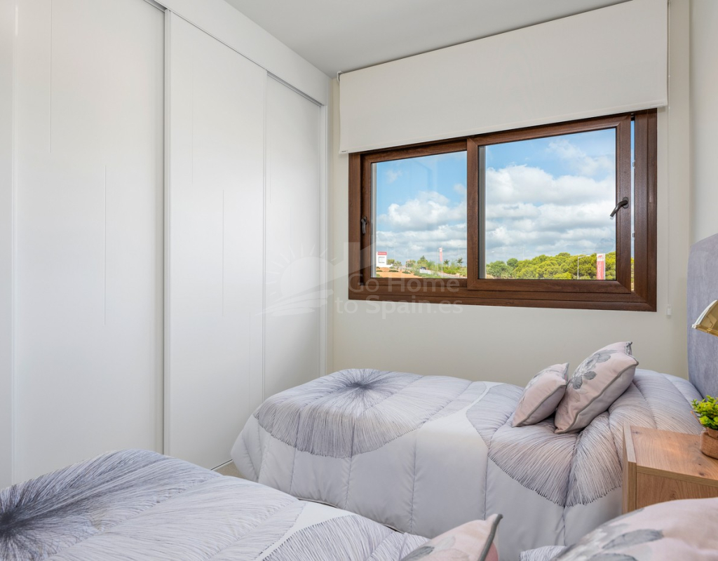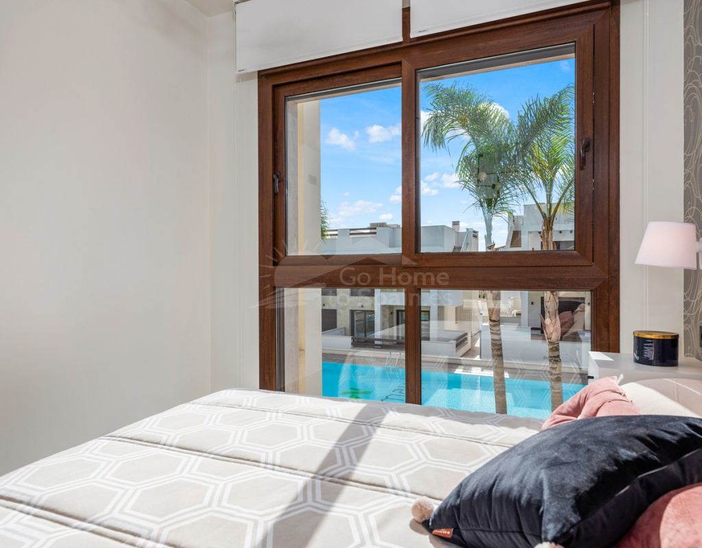 Bungalow de planta alta en urbanización de Torrevieja Qué suerte tendrás viviendo en este precioso bungalow de nueva construcción en Torrevieja. Pertenece a un lujoso residencial conocido como Los Balcones de Vivi, desde donde se divisan unas espectaculares vistas a La Laguna Rosa de Torrevieja. Un lugar como ningún otro para desconectar. La propiedad disfruta de una gran terraza privada que, cada mañana, cuenta con la presencia del inagotable sol de la Costa Blanca, además de unas bonitas vistas a los jardines y a las dos enormes piscinas comunitarias. Con el preciado clima del mediterráneo español, las zonas exteriores se convertirán en tu rincón sagrado. Podrás respirar el aire limpio y puro de la naturaleza y el mar Mediterráneo. Los interiores de la casa te conectan con estos preciosos exteriores gracias al diseño de sus puertas cristaleras y ventanales. Te sorprenderá descubrir qué se esconde en sus 70 m2: una cocina abierta moderna con barra para el desayuno, un luminoso salón comedor multifunctional, 3 habitaciones llenas de confort y 2 baños de ducha con las más altas especificaciones. Vivirás en una de las zonas más codiciadas de Torrevieja, con mucha oferta de ocio y muchos atractivos a tu alrededor: Paraje Natural de Lagunas de Torrevieja – La Mata Playas y calas de arenas suaves y aguas transparentes, certificadas con la Q de Calidad Turística 4 Campos de Golf, entre ellos Las Colinas Golf & Country Club Senderos y parques ecológicos ideales para pasear, fotografiar y caminar junto a tu mascota Centro comercial La Zenia Boulevard, el más grande de la provincia de Alicante Este bungalow busca un propietario como tú, con ganas de disfrutar del sol, las terrazas y todas las comodidades de la Costa Blanca Sur.