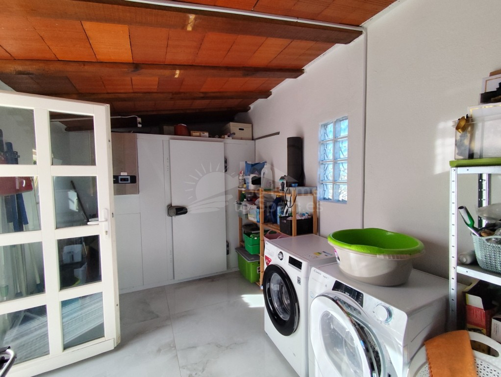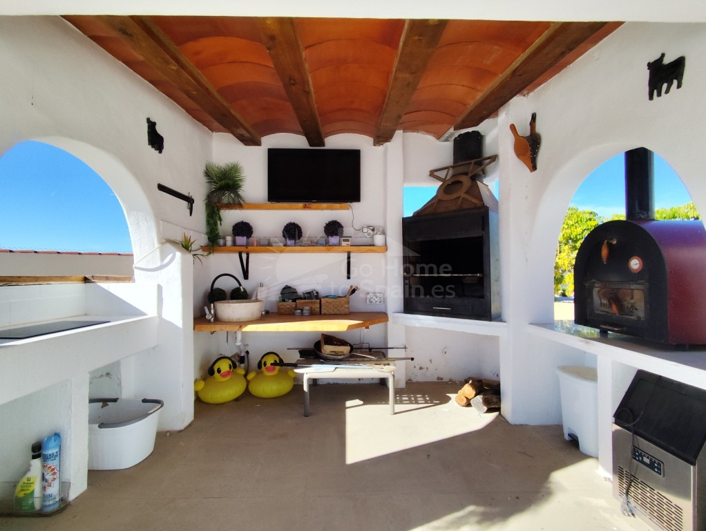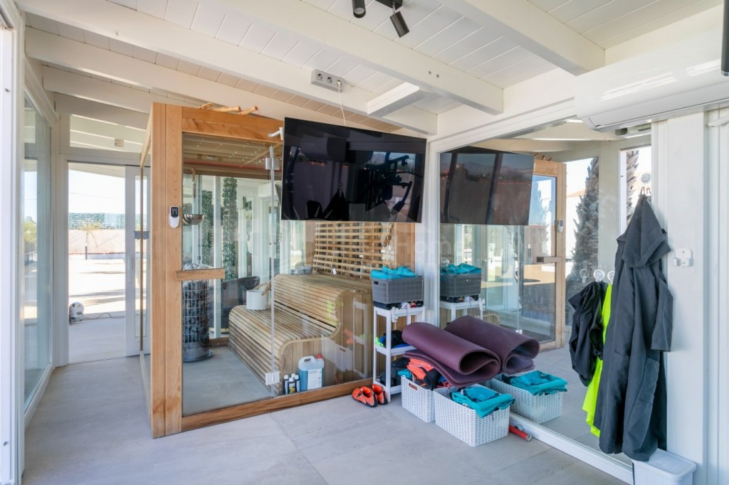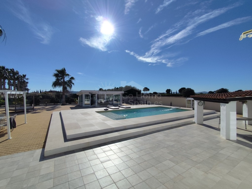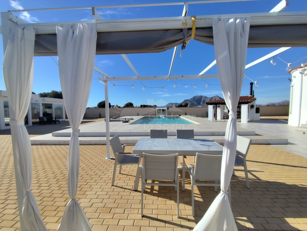 Exclusiva villa mediterránea en venta en Alicante, España: bienestar, privacidad y vistas panorámicas. Descubra esta lujosa villa mediterránea en un tranquilo valle de montaña cerca de Alicante, ideal para quienes buscan tranquilidad, privacidad y confort. Esta propiedad combina arquitectura clásica con diseño moderno y ofrece amplias instalaciones de bienestar, una hermosa piscina e impresionantes vistas panorámicas. Ubicación perfecta A 13 km de la playa A 40 km del aeropuerto de Alicante. A 2 km del pueblo con comercios y servicios. A 7 km de La Finca Golf Resort Parcela privada de 5.600 m² Totalmente vallada y delimitada con altos muros para máxima privacidad. Casa principal y dependencias de alta calidad diseñadas para la comodidad, la relajación y el bienestar. Casa principal: lujosa villa orientada al sur (165 m²) Cocina abierta con zona de comedor y vistas panorámicas al paisaje, las montañas y la piscina. Elegante sala de estar de forma ovalada Habitación doble con baño en suite Dormitorio principal con vestidor, baño integrado y aseo independiente. Grandes ventanales que proporcionan una luz natural óptima y una perfecta integración entre el interior y el exterior. Casa de huéspedes y dependencias Casa de huéspedes de madera (50 m²) con dormitorio, terraza y terraza cubierta con cocina y comedor. Edificio de almacenamiento de madera con baño. Vida al aire libre: estilo resort. Piscina de 50 m², profundidad 1,5 m Ducha solar y amplia zona de estar. Zona de barbacoa con parrilla de acero. Cocina exterior totalmente equipada (15 m²) con placa de inducción, horno tradicional, horno de pizza, fregadero, barra y zona de comedor. Instalaciones de bienestar Edificio de bienestar acristalado (40 m²) con sauna tradicional, sauna de infrarrojos y zona de relajación. Edificio técnico y de servicios (40 m²) Aparcamiento cubierto para dos vehículos Energía y tecnología 14 paneles solares para eficiencia energética Portón de entrada eléctrico con videoportero. Cámaras de seguridad y detectores de movimiento Doble acristalamiento antirrobo con filtros de protección solar y mosquiteras. Características adicionales Parcialmente amueblado, incluidos electrodomésticos. Aire acondicionado (frío/calor), calefacción eléctrica y televisión/internet en todos los edificios. pozo de agua privadoárboles frutales, olivos y palmeras Impresionantes vistas abiertas del paisaje y las montañas circundantes. Esta villa mediterránea en venta en Alicante ofrece la combinación perfecta de lujo, privacidad y bienestar, ideal como residencia principal, segunda vivienda o inversión exclusiva. Póngase en contacto con Sunrisa hoy mismo para obtener más información o para programar una visita privada a esta propiedad única.