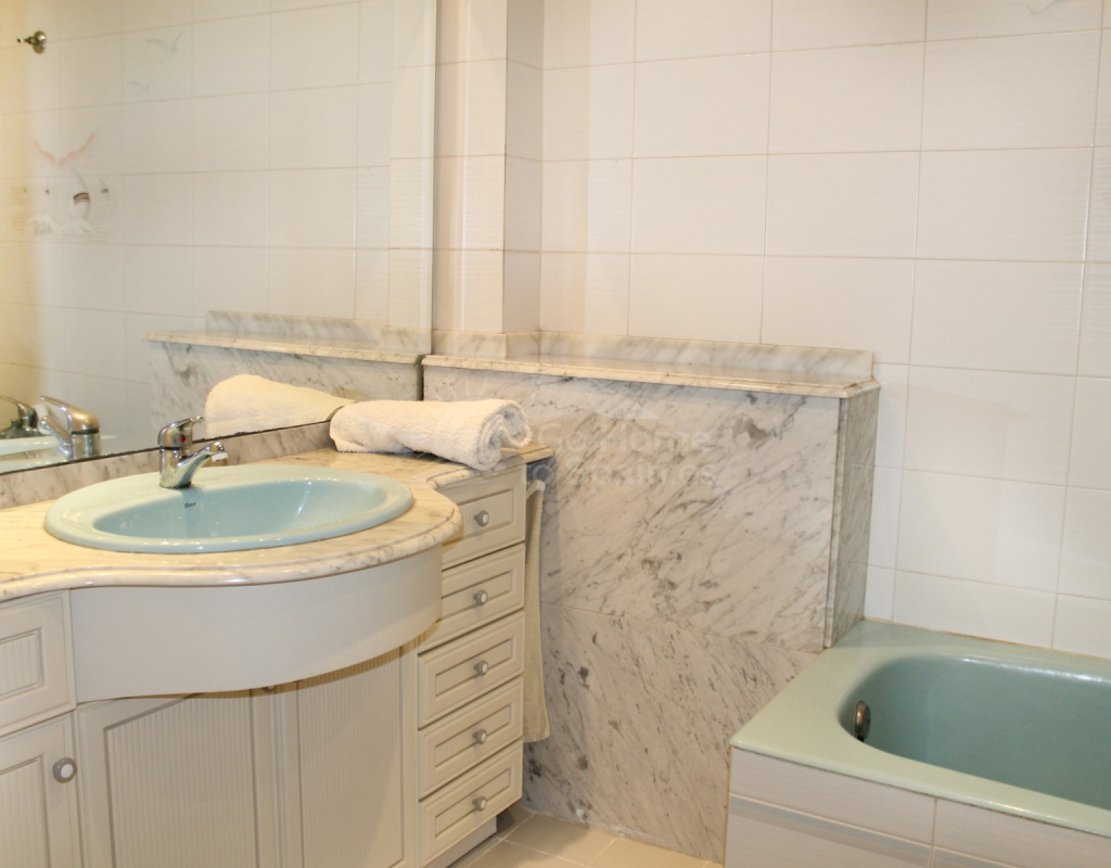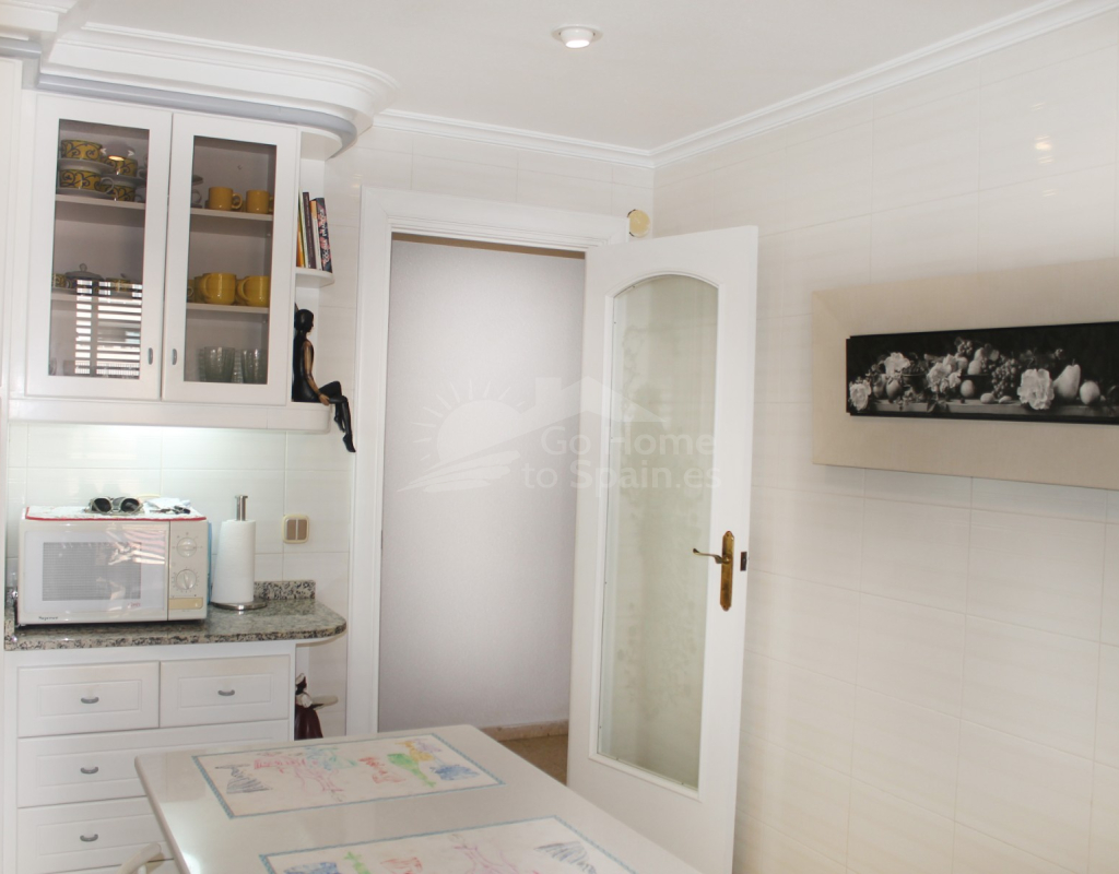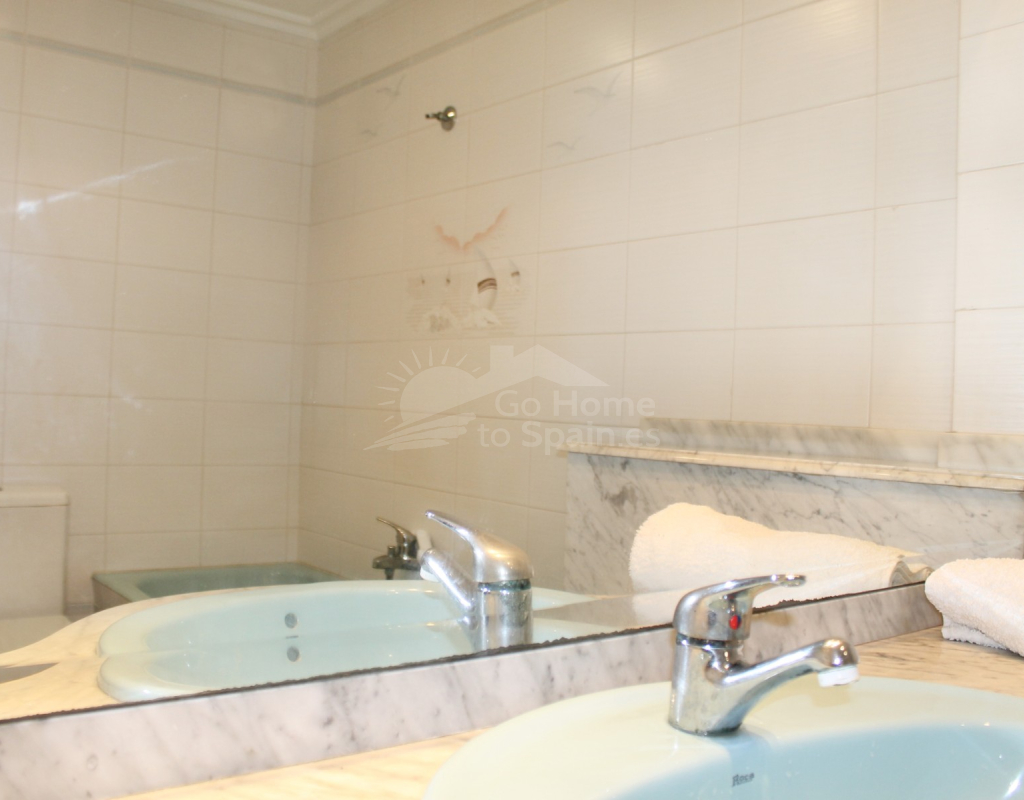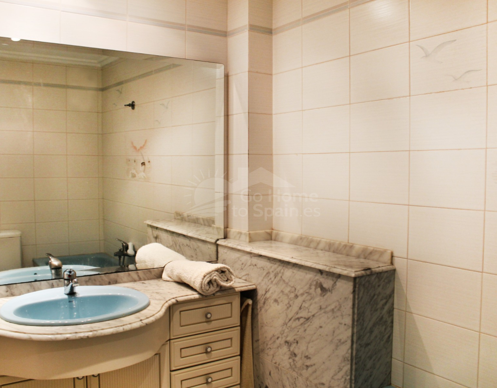 La distribución incluye cuatro habitaciones, dos de ellas con armarios empotrados, y todas ofrecen vistas al mar. Los dos baños son amplios y cuentan con bañera. La cocina es grande y tiene una galería, desde donde también se puede apreciar el paisaje marino. El salón es espacioso, permitiendo crear dos ambientes, y cuenta con aire acondicionado y bomba de calor, lo que lo convierte en un espacio cómodo durante todo el año.