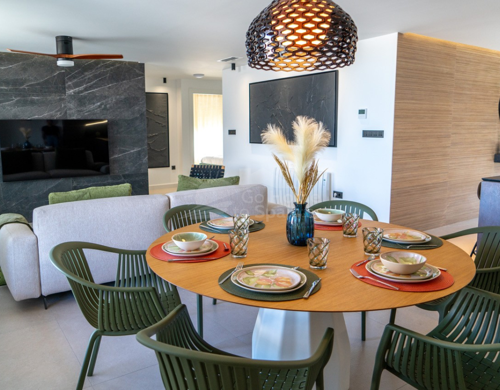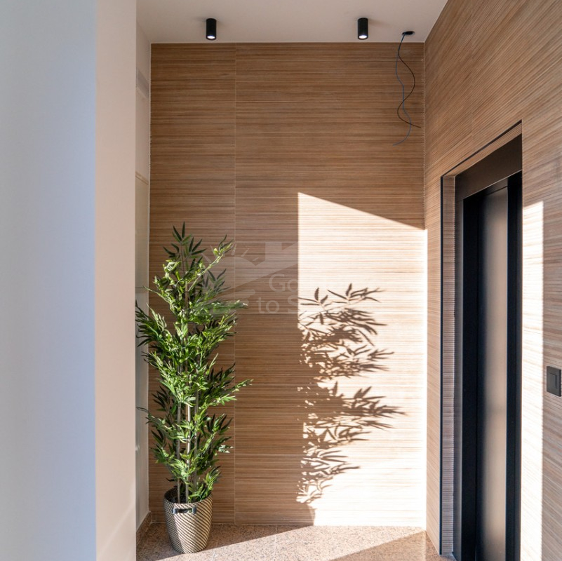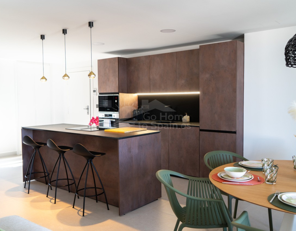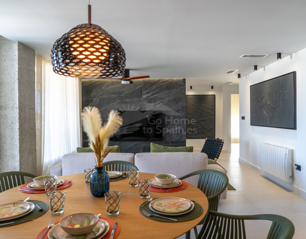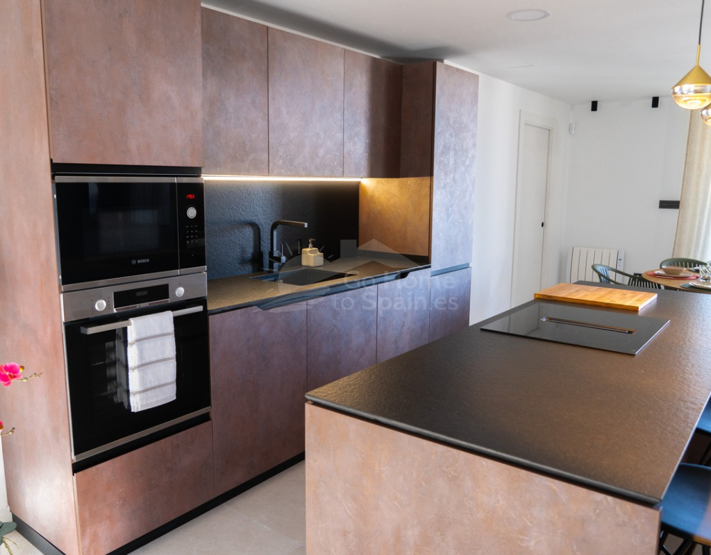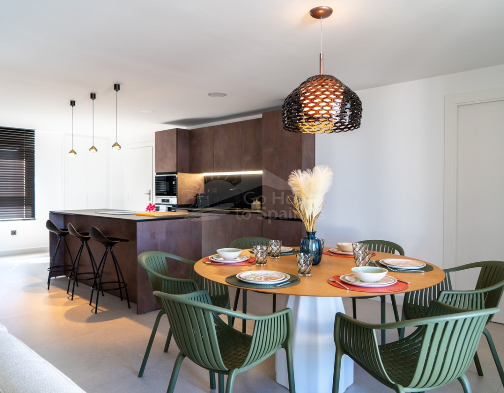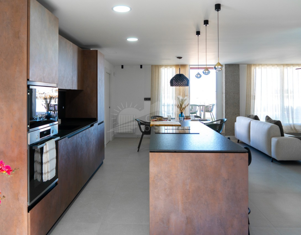 El interior destaca por su estilo elegante y funcional: una cocina italiana de diseño totalmente equipada con electrodomésticos, tres dormitorios y tres baños completos (uno en suite), además de aire acondicionado por conductos y calefacción de calor azul en todas las estancias. Los materiales de alta gama, como las ventanas Schüco y la puerta de seguridad con apertura mediante código, garantizan la máxima calidad y confort.