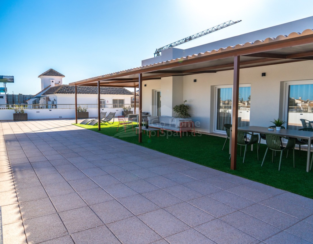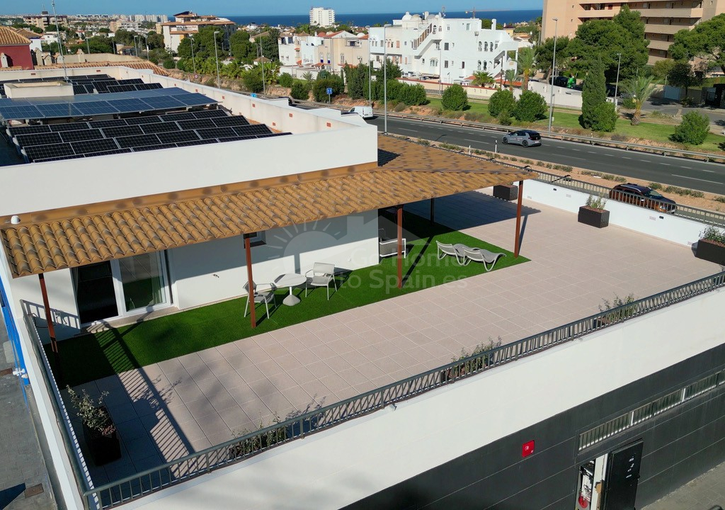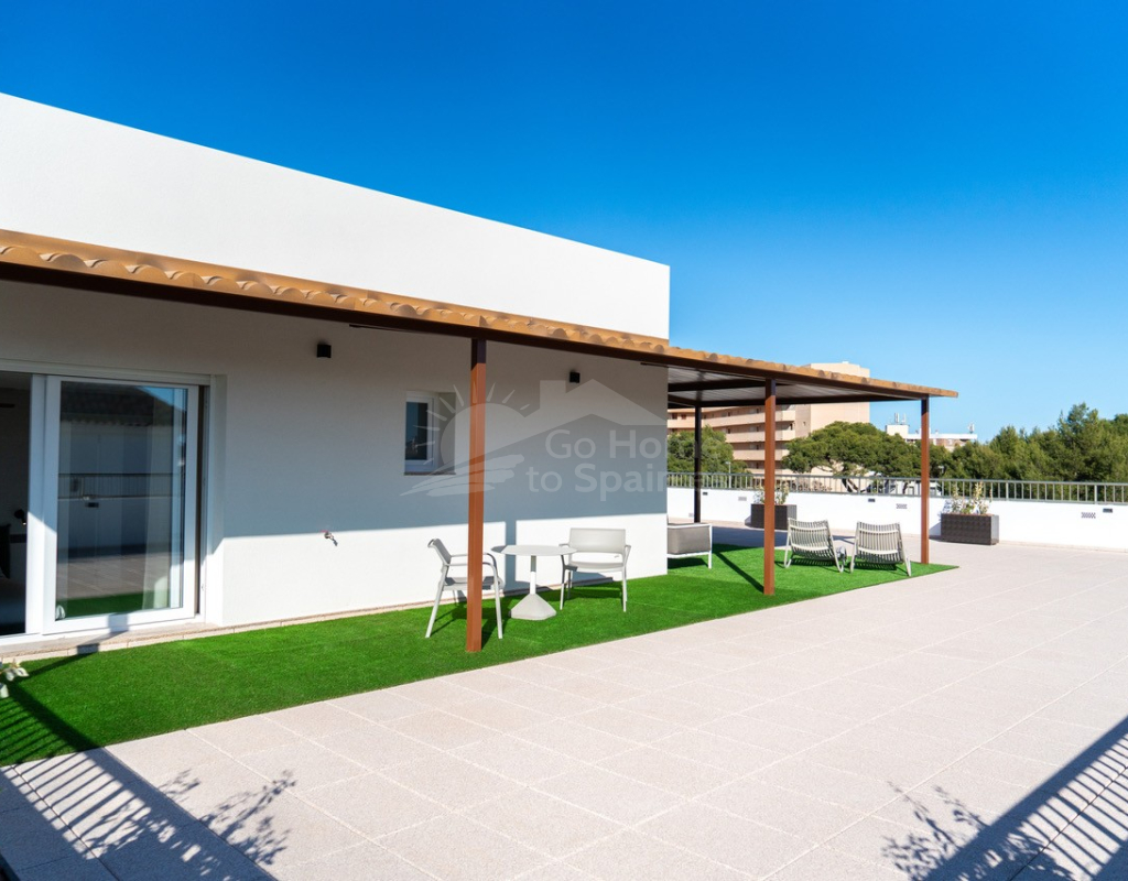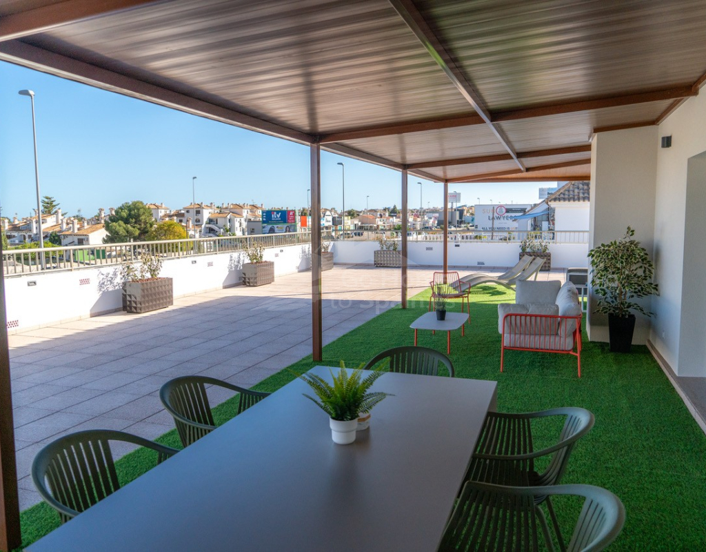 En el corazón de La Zenia (Orihuela Costa) se encuentra este exclusivo apartamento de lujo de 122 m² que combina privacidad, diseño contemporáneo y confort mediterráneo. Situado en la primera planta de un edificio con solo dos viviendas y ascensor, ofrece la tranquilidad de un ático sin vecinos arriba. Su impresionante terraza privada de 250 m² con una maravillosa zona de barbacoa, porche cubierto, césped artificial y amplias áreas de descanso convierte este hogar en un auténtico refugio al aire libre ideal para disfrutar del sol durante todo el año.