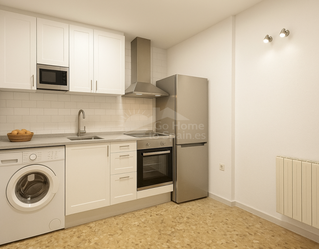 Incluye preinstalación de cocina, aún sin montar, y renderizados 3D que muestran el potencial estético del espacio, especialmente de la cocina y el dormitorio secundario.