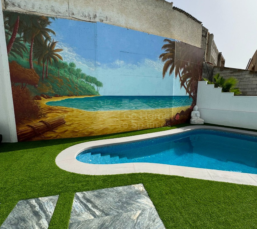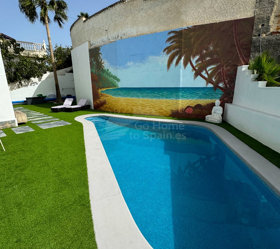 En el exterior, la villa cuenta con una encantadora piscina privada climatizada, rodeada de césped artificial de alta calidad, y un jardín cuidado con árboles frutales como plátanos, granados e higueras, creando un ambiente mediterráneo relajante y elegante. La propiedad incluye estacionamiento privado dentro de la parcela.
