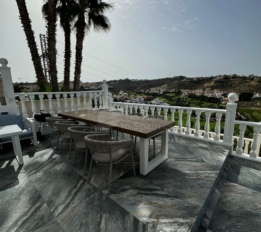 La propiedad ofrece una distribución generosa y versátil, con 8 dormitorios, 4 baños, 2 amplios salones y 2 cocinas completamente equipadas, lo que la hace perfecta para familias numerosas, invitados o incluso para un uso combinado residencial y recreativo. Dispone además de 2 terrazas con vistas espectaculares, ideales para disfrutar del entorno natural y del atardecer sobre el campo de golf.