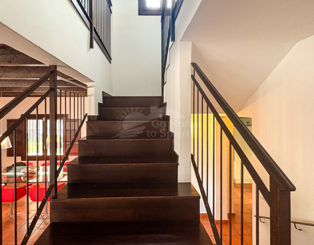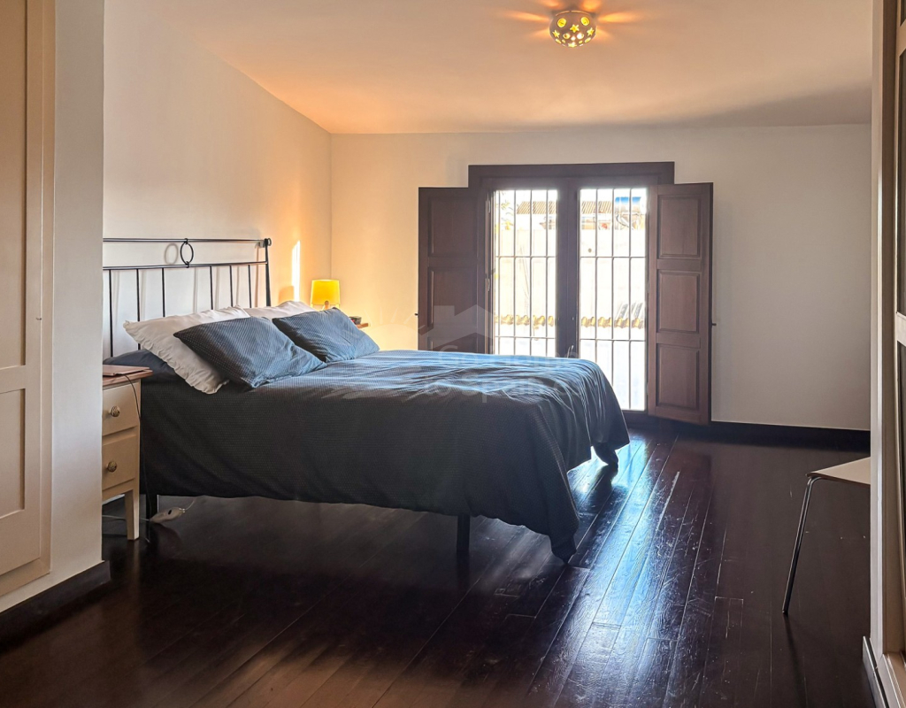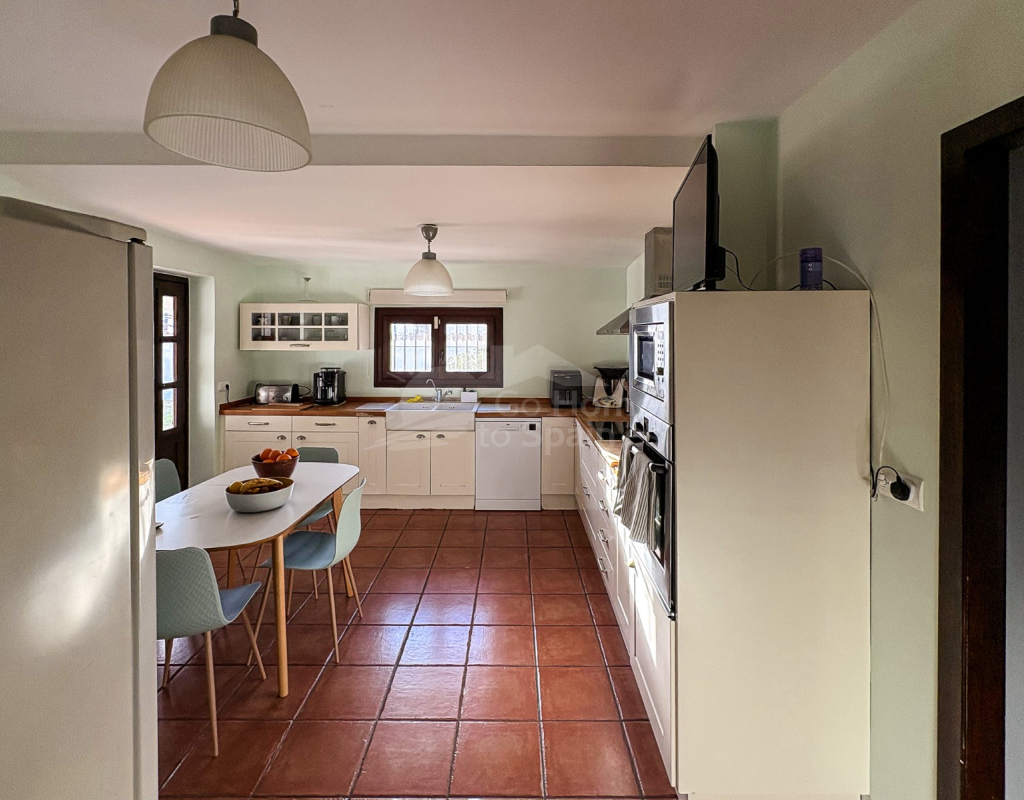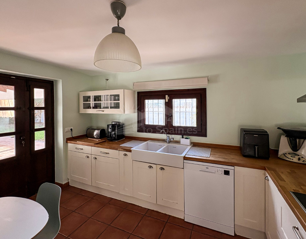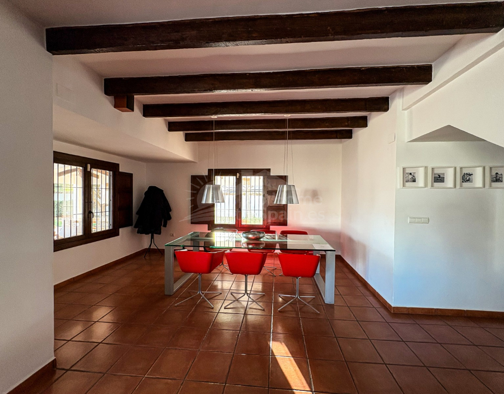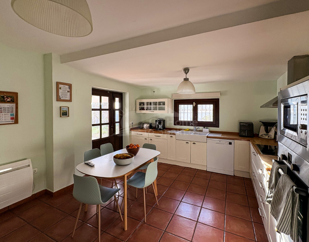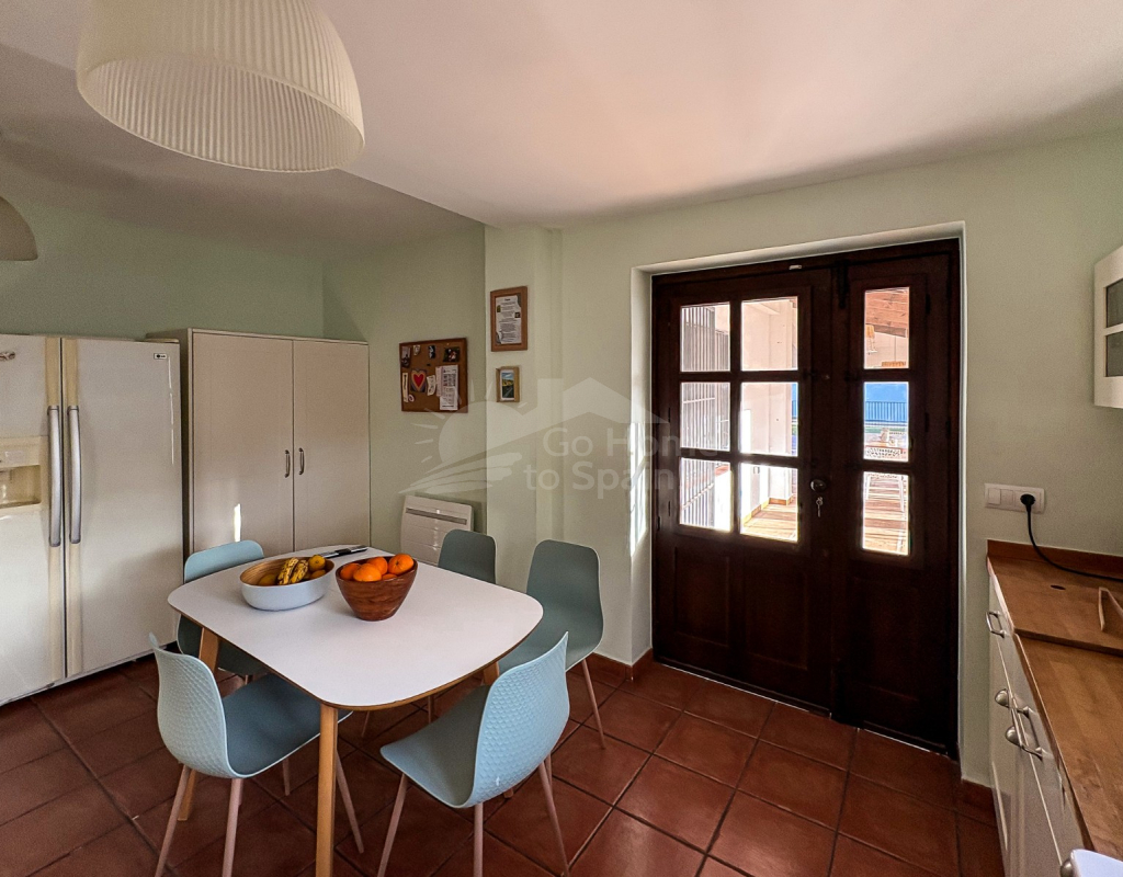 La cocina independiente, de grandes dimensiones, ofrece acceso directo a la terraza, facilitando la conexión entre interior y exterior. El salón incorpora un elegante cerramiento tipo escaparate, que aporta un contraste contemporáneo a la esencia mediterránea de la vivienda, generando una atmósfera moderna sin perder carácter.