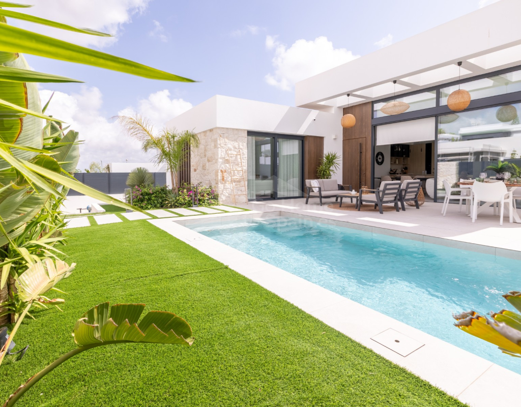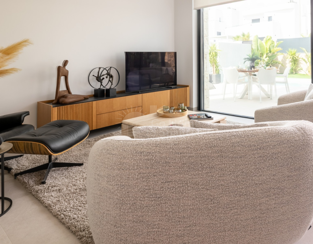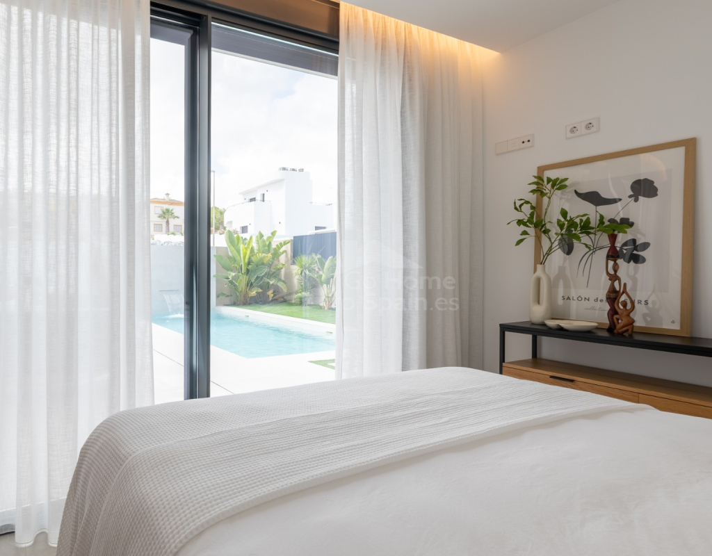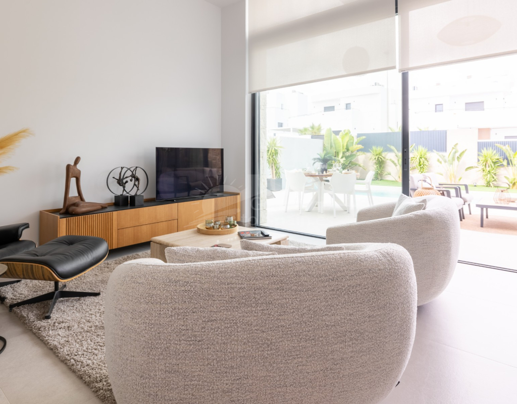 Descubre esta impresionante villa moderna en Rojales (Alicante), con 272 m² construidos sobre una parcela de 370 m². La vivienda cuenta con 4 amplios dormitorios y 4 baños, un salón-comedor luminoso con cocina abierta totalmente equipada, además de sala polivalente, lavadero y vestidor. Su diseño contemporáneo, con grandes ventanales y acabados de primera calidad, ofrece espacios elegantes y confortables. En el exterior podrás disfrutar de una piscina privada con cascada, terrazas soleadas y un jardín de bajo mantenimiento, perfectos para relajarse o compartir momentos en familia. Situada en la exclusiva urbanización La Bernada, en Rojales, la propiedad combina tranquilidad y comodidad, con todos los servicios a pocos minutos: supermercados, restaurantes, colegios y centros deportivos, además de prestigiosos campos de golf en el entorno. A tan solo 10 minutos de las playas de Guardamar y La Mata, y a 30 minutos del aeropuerto de Alicante, esta villa es la opción ideal tanto como residencia permanente como para vacaciones en la Costa Blanca.