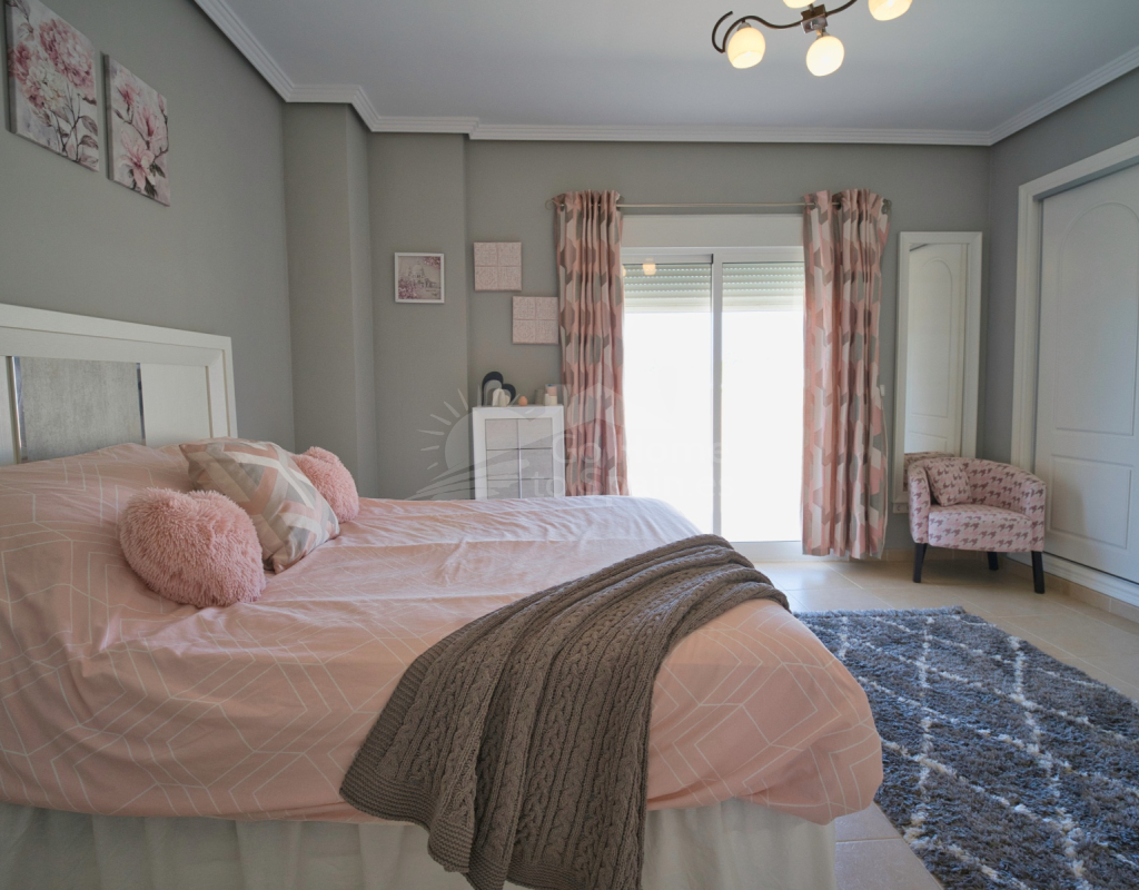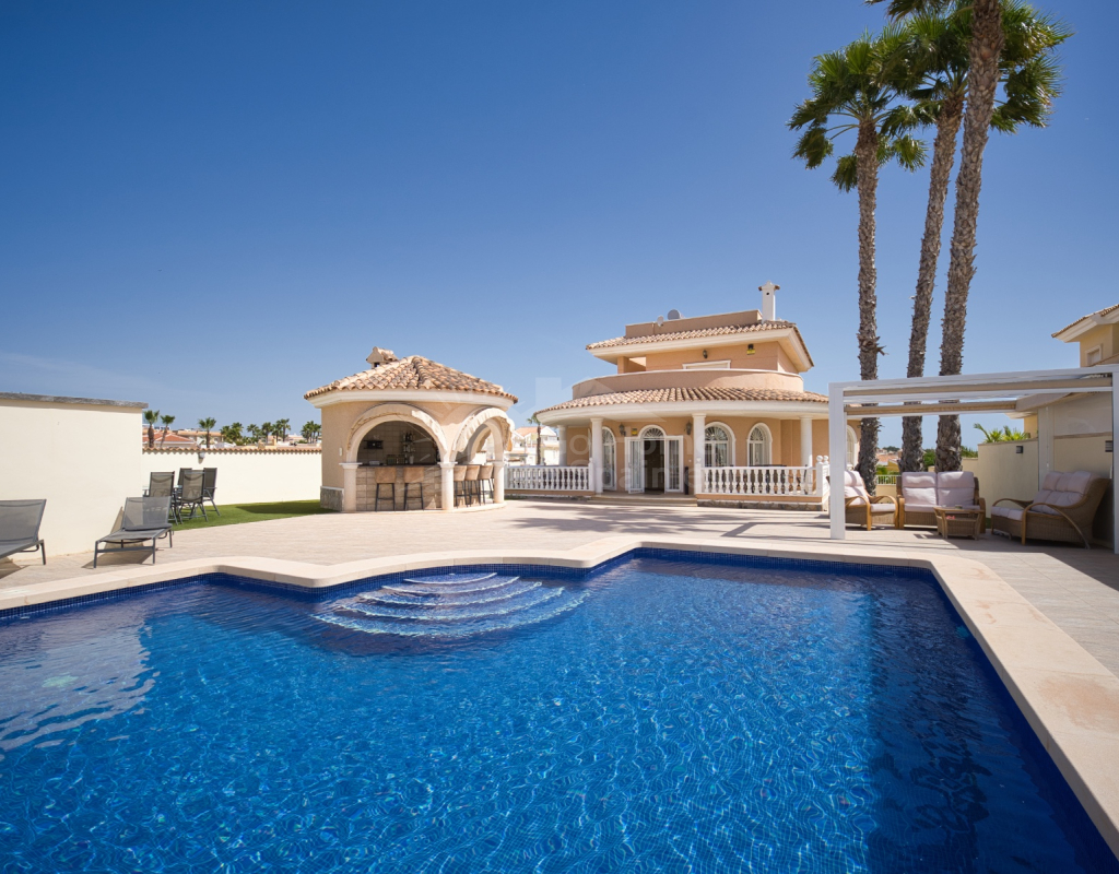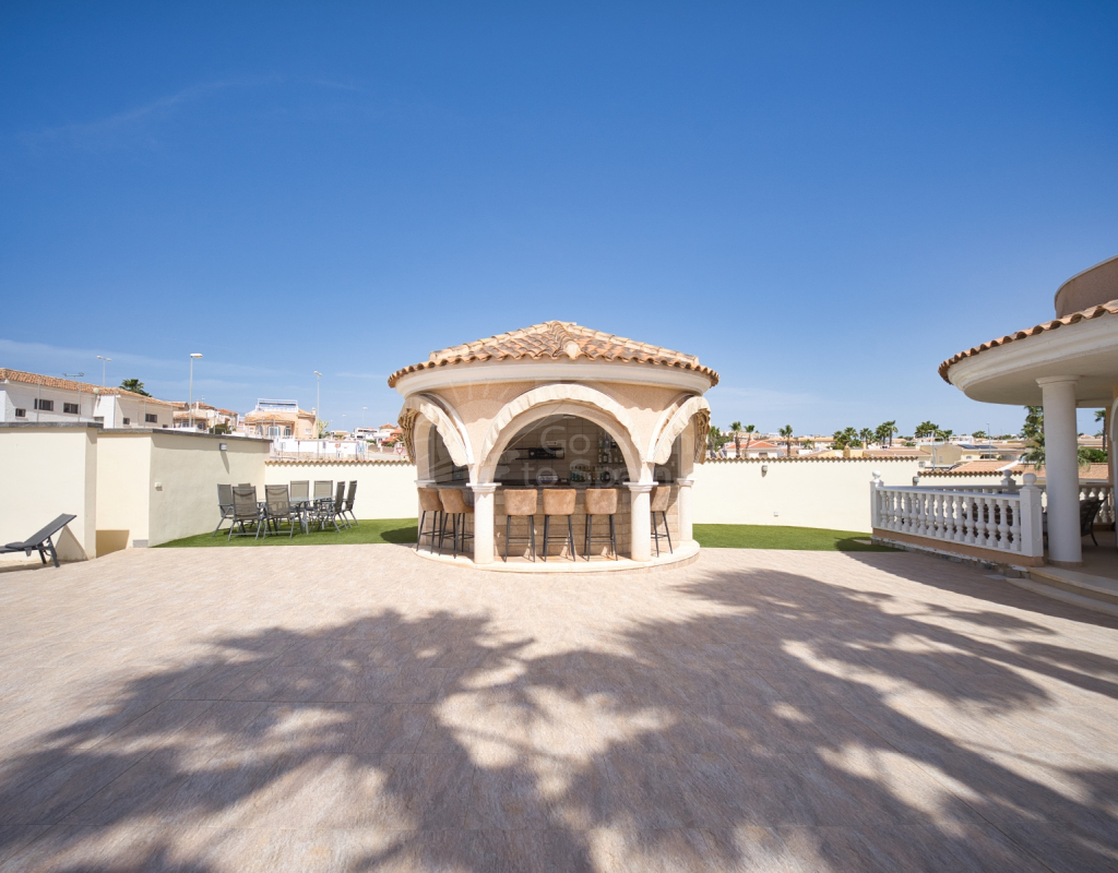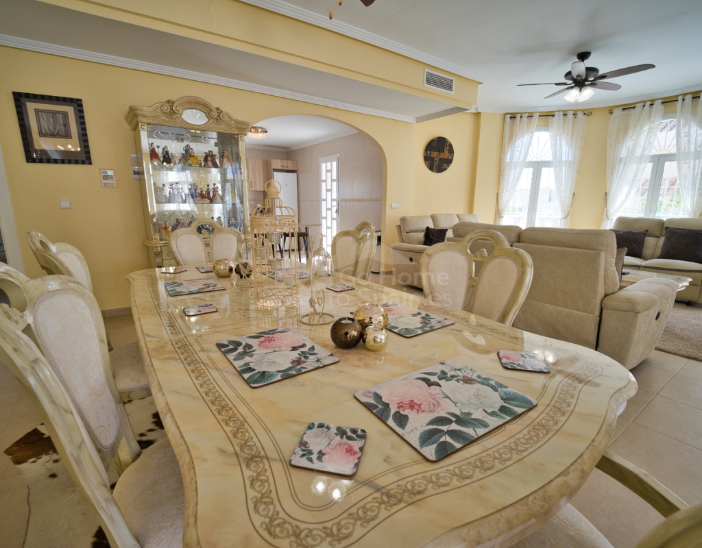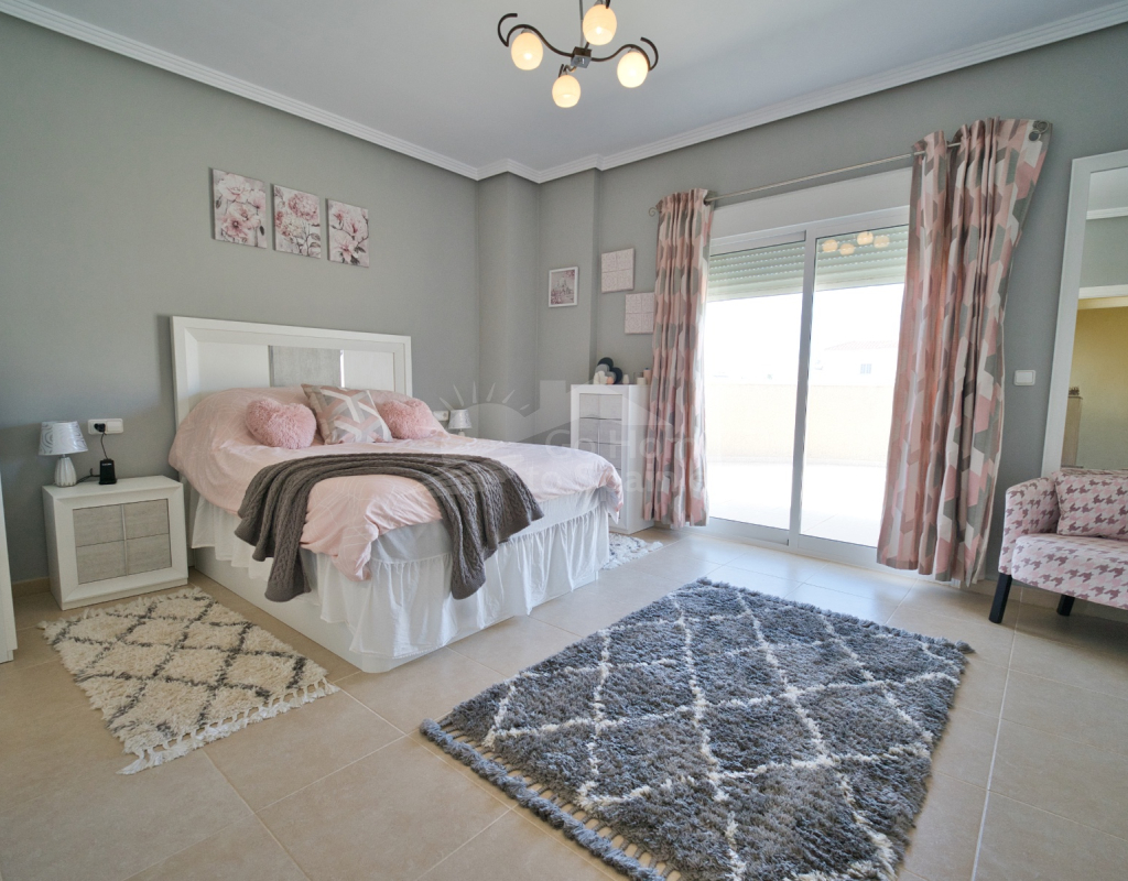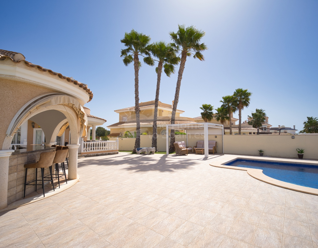 Nos complace ofrecer esta impresionante villa independiente de 4 dormitorios y 3 baños con piscina en la zona más cotizada de Ciudad Quesada. Situada en una generosa parcela de 786 m², esta hermosa vivienda ofrece espacio, comodidad y un toque de lujo en todas sus estancias. En la planta baja encontrará dos amplios dormitorios dobles y un gran y elegante cuarto de baño familiar. La zona de estar diáfana es realmente espectacular, tan grande que cuenta con dos zonas de salón diferenciadas, un comedor y una cocina totalmente equipada. Es el espacio perfecto para la vida familiar o para recibir invitados. En la planta superior encontrará otros dos amplios dormitorios, ambos con modernos cuartos de baño en suite. El dormitorio delantero tiene acceso a una enorme terraza privada con vistas al jardín, fácil de mantener, y a la acogedora zona de la piscina privada. Subiendo de nuevo, se llega a la azotea, donde las vistas se extienden a lo largo de los lagos salados y hasta el mar Mediterráneo, simplemente impresionante. En el exterior, esta casa sigue impresionando. Hay dos terrazas cubiertas en la parte delantera de la villa, ideales para comer al aire libre o relajarse a la sombra. Una encantadora zona con pérgola, un bar bien equipado con televisión y taburetes y un garaje individual con techo retráctil. Otras características adicionales son el aire acondicionado y la calefacción central. La villa se vende completamente amueblada con muebles de buen gusto y alta calidad en todas las estancias.