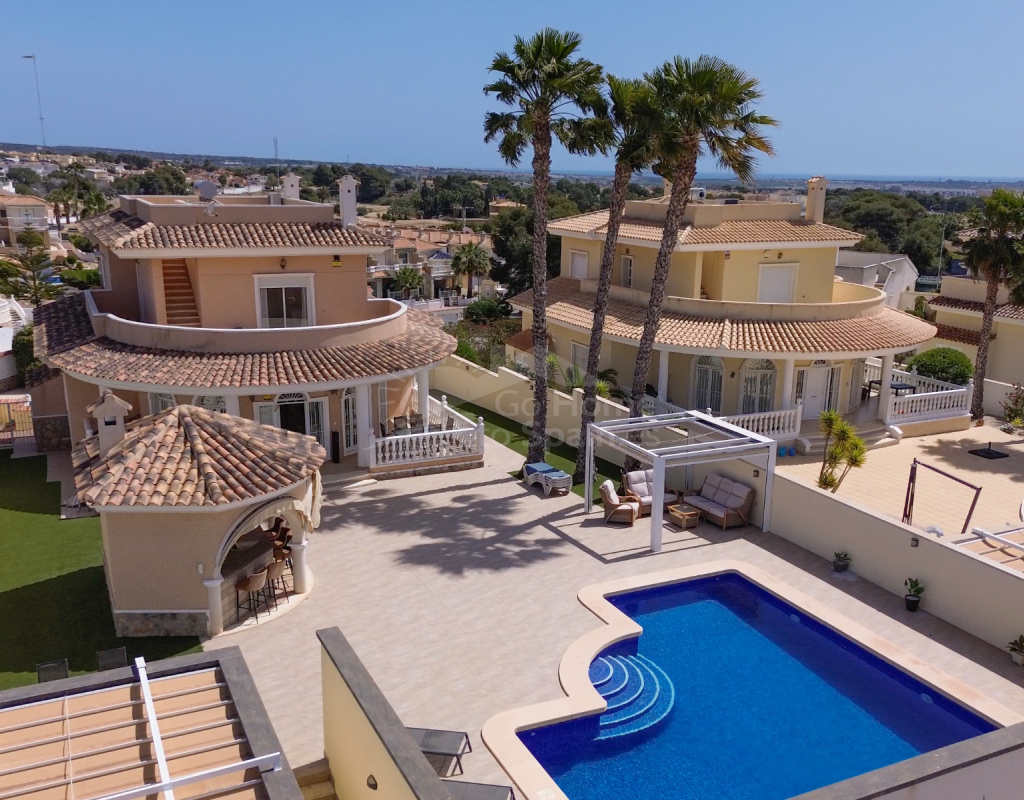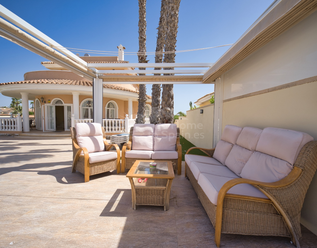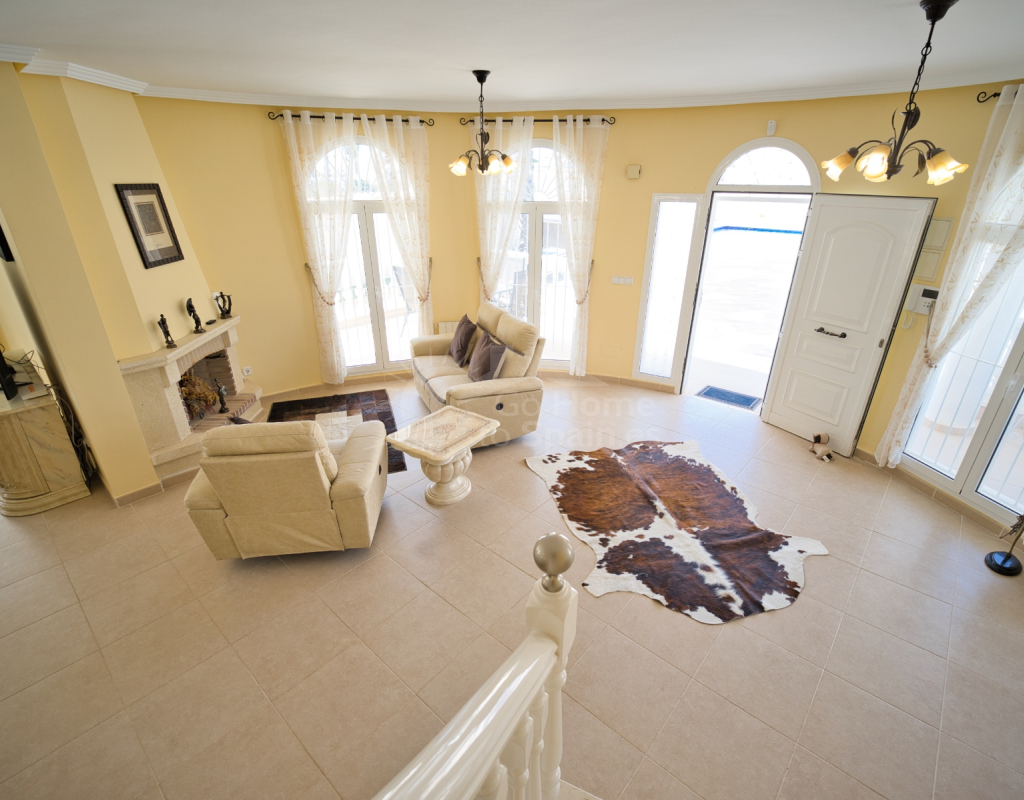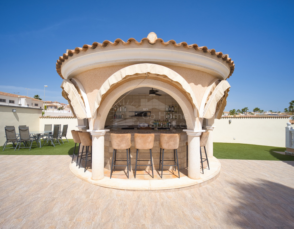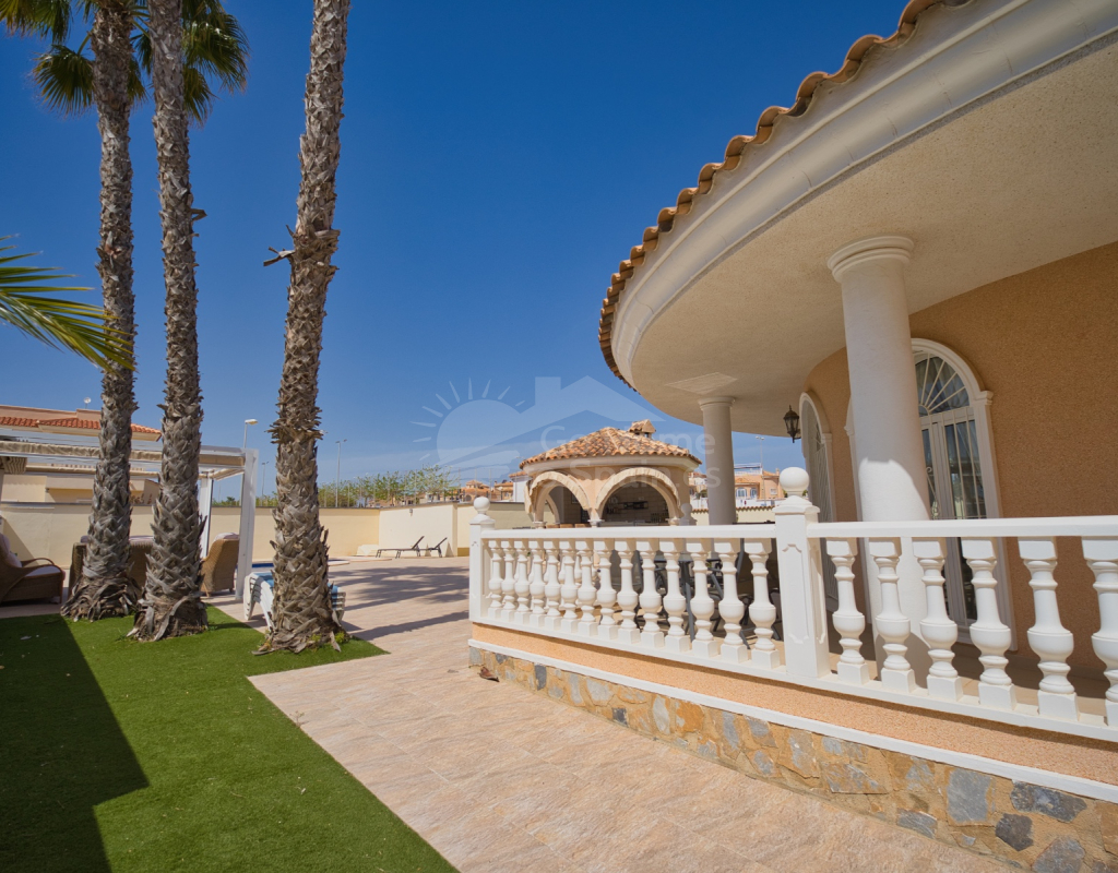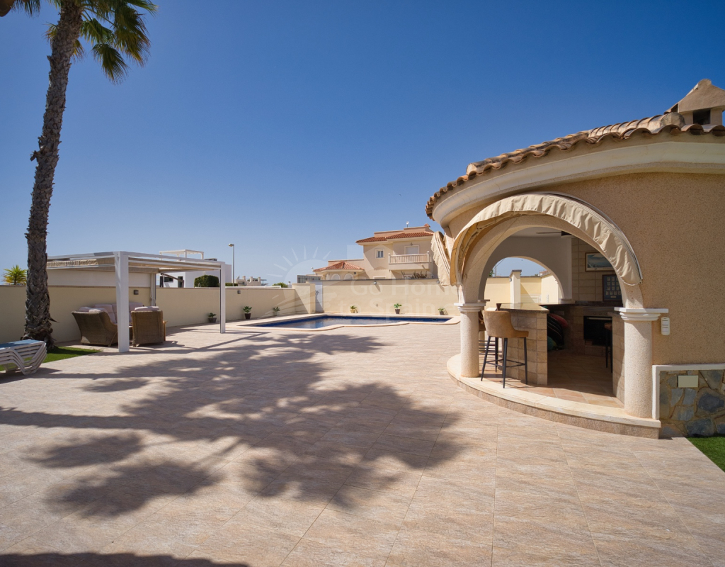 Nos complace ofrecer esta impresionante villa independiente de 4 dormitorios y 3 baños con piscina en la zona más cotizada de Ciudad Quesada. Situada en una generosa parcela de 786 m², esta hermosa vivienda ofrece espacio, comodidad y un toque de lujo en todas sus estancias. En la planta baja encontrará dos amplios dormitorios dobles y un gran y elegante cuarto de baño familiar. La zona de estar diáfana es realmente espectacular, tan grande que cuenta con dos zonas de salón diferenciadas, un comedor y una cocina totalmente equipada. Es el espacio perfecto para la vida familiar o para recibir invitados. En la planta superior encontrará otros dos amplios dormitorios, ambos con modernos cuartos de baño en suite. El dormitorio delantero tiene acceso a una enorme terraza privada con vistas al jardín, fácil de mantener, y a la acogedora zona de la piscina privada. Subiendo de nuevo, se llega a la azotea, donde las vistas se extienden a lo largo de los lagos salados y hasta el mar Mediterráneo, simplemente impresionante. En el exterior, esta casa sigue impresionando. Hay dos terrazas cubiertas en la parte delantera de la villa, ideales para comer al aire libre o relajarse a la sombra. Una encantadora zona con pérgola, un bar bien equipado con televisión y taburetes y un garaje individual con techo retráctil. Otras características adicionales son el aire acondicionado y la calefacción central. La villa se vende completamente amueblada con muebles de buen gusto y alta calidad en todas las estancias.