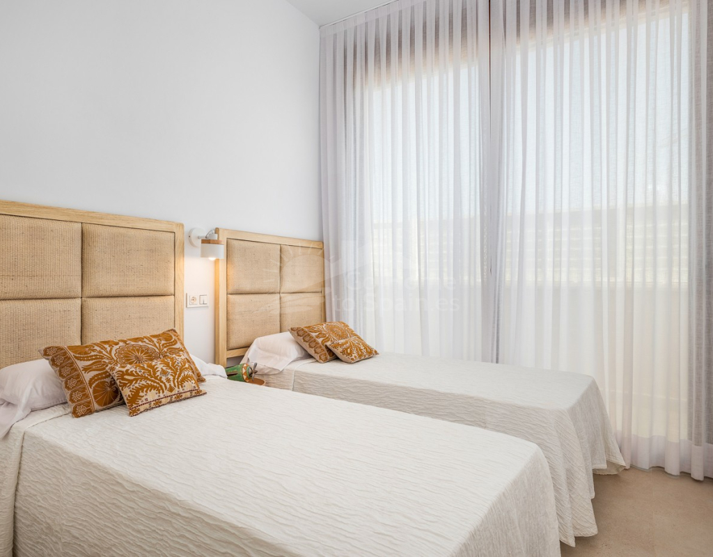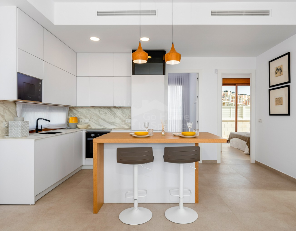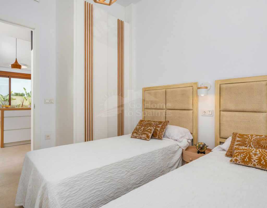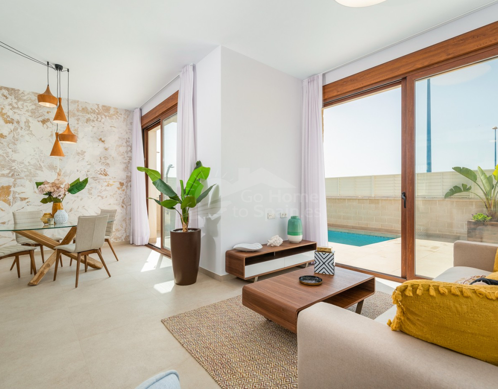 New build villa for sale in Vera, Almeria In this beautiful new build villa in Almeria you can breathe sea, warmth, but above all fantasy. It is located just 200 metres from a stunning beach of soft sand and crystal clear waters, one of the most beautiful beaches in Vera, where walks in the sun become a very healthy habit all year round. This new build property in Vera is part of a residential complex of 100 independent villas known as Monte Carmelo Resort, an enclosure of comfort, elegance and design on the shores of the Mediterranean Sea. This modern urbanisation is divided into two models: Laguna Azul, with double heigh and Modelo Estrella, all on one floor. This particular single-family home belongs to the latter, bringing out its charming Mediterranean design with wooden skirting boards, natural stone finishes and white single-layer cladding, offering greater luminosity and brightness to the property as a whole. All of them have a private plot with a 6 x 3 metre swimming pool with coloured lights and waterfall, terrace-garden and a large solarium, where you can set up your own chill-out area with pre-installation for a Jacuzzi and outdoor kitchen. The ideal place to relax with a good drink while soaking up the sun during the day and at night, while contemplating the stars in silence. The perfect property for a better life in Spain Everyone needs a place to unwind, preferably somewhere with a good climate and good beaches. And that is exactly what this property offers: a holiday life with sun, a stone's throw away from the best naturist beaches and a multitude of services, just 10 minutes away from the residential area, which you can easily access so that nothing is missing in your day to day life. You will be surprised to discover the quality of the interiors of this 3-bedroom, 2-bathroom property. Don't miss out on its modern fitted kitchen with silestone worktop and LED lights, its open plan living-dining room with double height glass window door and its rooms flooded with magical natural light. This brand new house on the Almeria coast will steal your heart, why not discover it and fall in love with its surroundings and style? Visit our showhouse: Avenida Ciudad de Barcelona S/N, 04621 Vera Playa, Almería.