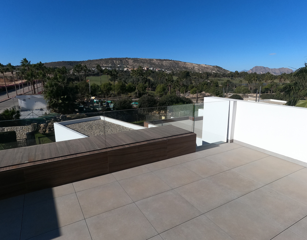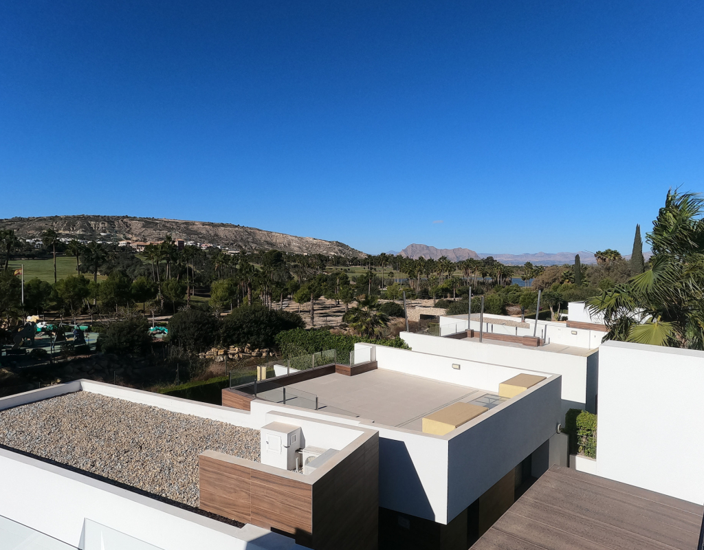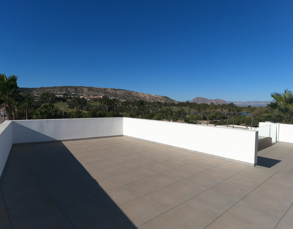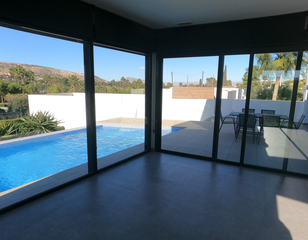 Stunning South-Facing Villa in prominent position to La Finca Golf with Exceptional Privacy, Infinity Pool & a 120m² Designer Underbuild. Positioned on one of the most privileged front line plots in all of La Finca Golf, this modern 4-bedroom villa combines architectural elegance, panoramic golf and mountain views, complete privacy, and a unique 120m² daylight-filled under build with spectacular pool windows — a feature rarely found anywhere in Spain. Just 30 minutes from Alicante Airport, this is the ideal base for year-round living, long golf weekends, or a premium holiday home. Property Overview 4 bedrooms 3 bathrooms + 1 guest WC 300 m² built area (including 120 m² under build) 440 m² private plot South-facing Front line golf position with uninterrupted views Infinity private pool with pool-window feature Large terraces + 65 m² solarium Parking area and dual access (front & back entrances) No community fees A Home Designed Around Light, Views and Privacy The villa enjoys one of the most private positions on La Finca — a rarity on the resort. No neighbouring properties overlook the pool, terraces or solarium, allowing for complete sunbathing privacy, even au naturel if desired. The elevated plot and open vistas provide a serene, exclusive atmosphere from sunrise to sunset. Main Living Area The ground floor is a bright, open-plan space framed by floor-to-ceiling glass, bringing views and sunlight into every corner. Spacious living room with panoramic views High ceilings for an airy architectural feel Direct access to the pool and terraces Seamless indoor–outdoor flow The Siemens-equipped kitchen includes: Siemens refrigerator Siemens dishwasher Dual Siemens ovens AEG induction hob with integrated extractor Abundant worktop and storage space Breakfast bar island Bedrooms and Bathrooms The villa offers four well-appointed bedrooms, each with large fitted wardrobes and beautiful natural light. Main level Three bedrooms, one with en-suite with bathtub Direct terrace and pool access from two bedrooms Additional family shower room Upper level Master suite with private bathroom Sliding doors to a spectacular wrap-around solarium Far-reaching views over the golf course and surrounding mountains 120 m² Underbuild — A Rare, Versatile Living Space This remarkable level is unlike anything else on La Finca: Flooded with natural light Show-stopping glass windows looking directly into the pool Guest WC + full laundry area (Siemens washing machine & Siemens dryer) This space can be transformed into: Cinema room Gym Games & bar lounge Additional living quarters Office + studio Wellness spa area The cool summer temperatures make it ideal for year-round use. Outdoor Living Infinity pool with underwater windows Large sun terraces with unbeatable views Beautiful low-maintenance landscaping South orientation for maximum sun exposure Elevated plot ensuring privacy 65 m² rooftop solarium for sunsets, yoga, dining, or a jacuzzi Additional Features Mitsubishi Electric air conditioning (efficient heating & cooling) Motion-detection alarm system High-speed fiber optic internet Electric shutters Front and rear access ideal for guests or deliveries Short walk to restaurants, bars, shops and services Access to La Finca’s spa, golf academy, padel and tennis club, and fitness facilities Lifestyle and Location La Finca Golf is one of Spain’s most highly regarded golf resorts, ranked among the Top 100 Golf Resorts in Europe. The villa is within minutes of: Renowned golf course with academy Tennis & padel club Luxury hotel & spa Gyms, hiking routes & mountain biking trails Excellent restaurants and entertainment Award-winning beaches (20 minutes) A rare combination of luxury, architecture, natural light, privacy, and an unbeatable front line setting. Viewing Highly Recommended Homes with this level of privacy, orientation and design are rarely available. Viewings are by appointment only.
