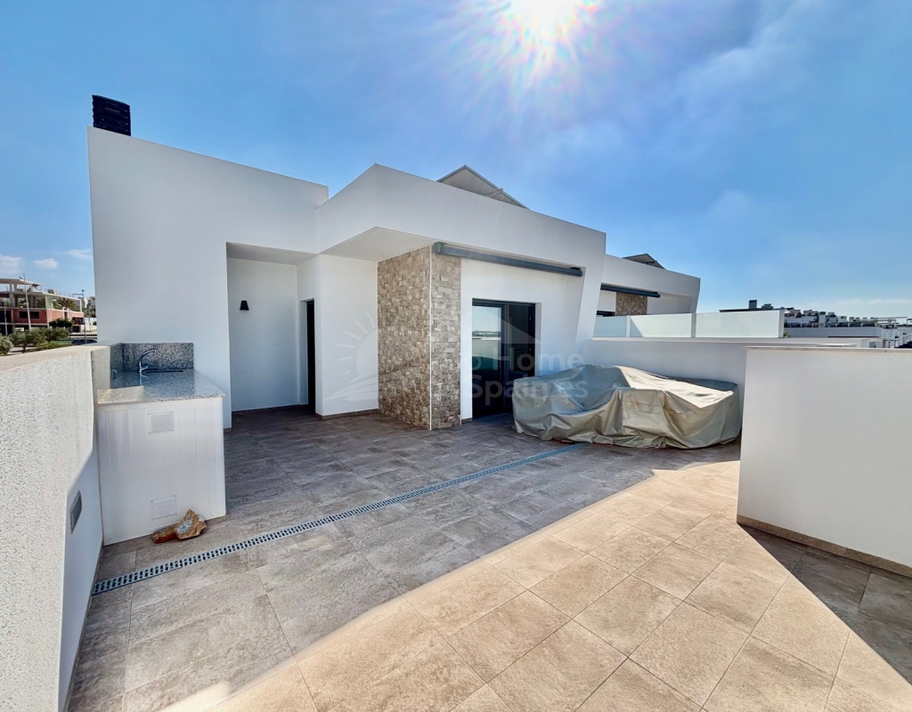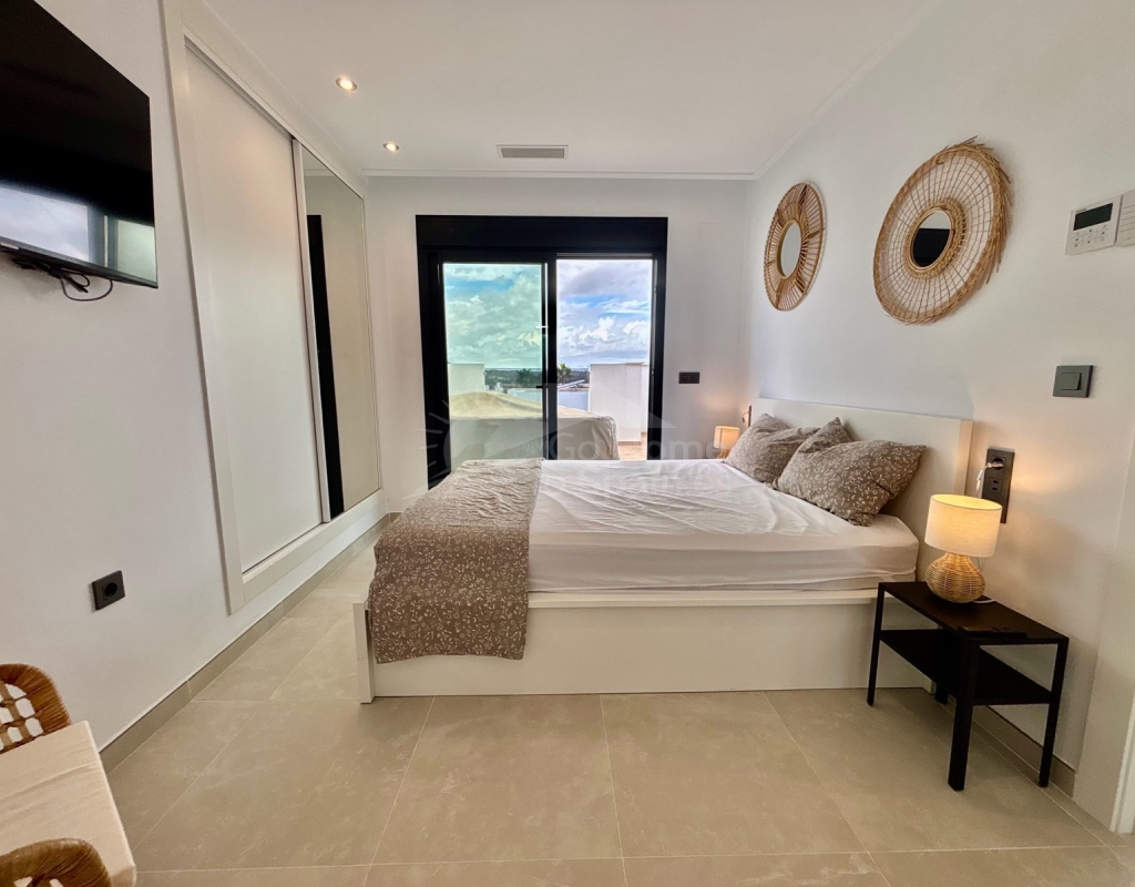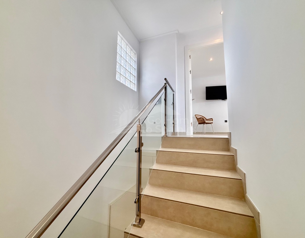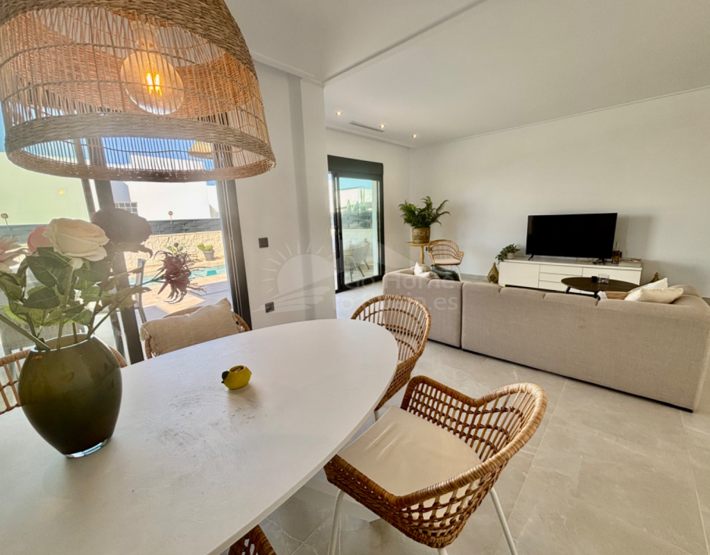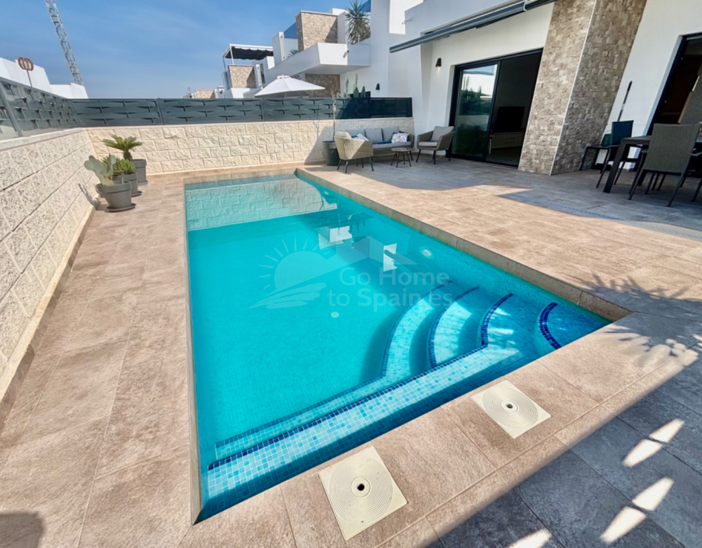 The villa is distributed over two levels with bright open-plan interiors and the option to reinstate a third bedroom. Outside, enjoy a private pool, multiple terraces, and a rooftop solarium — ideal for relaxing or entertaining.