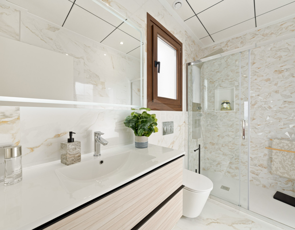 Excellent detached Villas all on one floor with 3 bedrooms + 3 bathrooms en suite, large plot from 351 m2, porch, parking space and private swimming pool 7x3 m. with beach area.