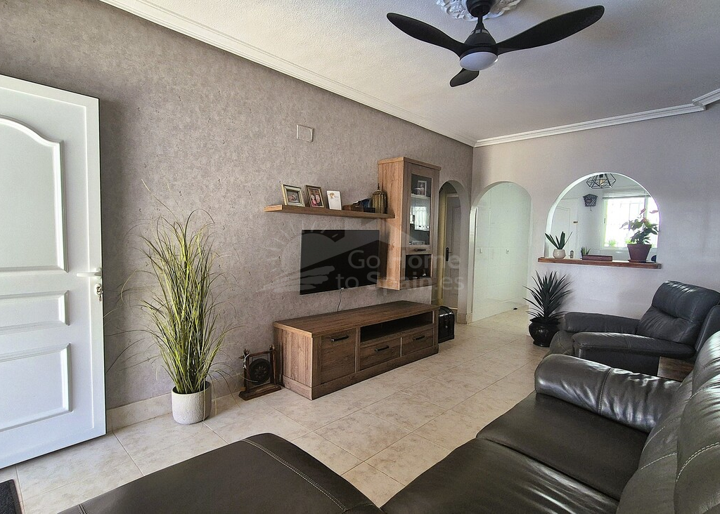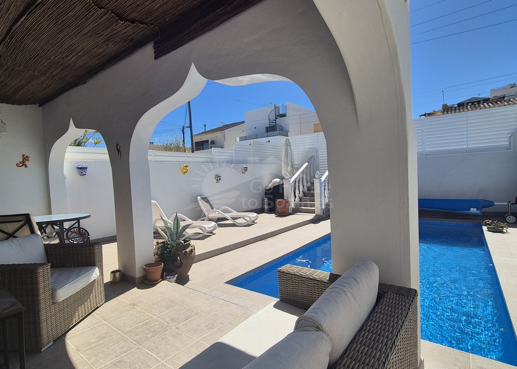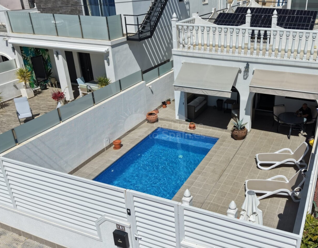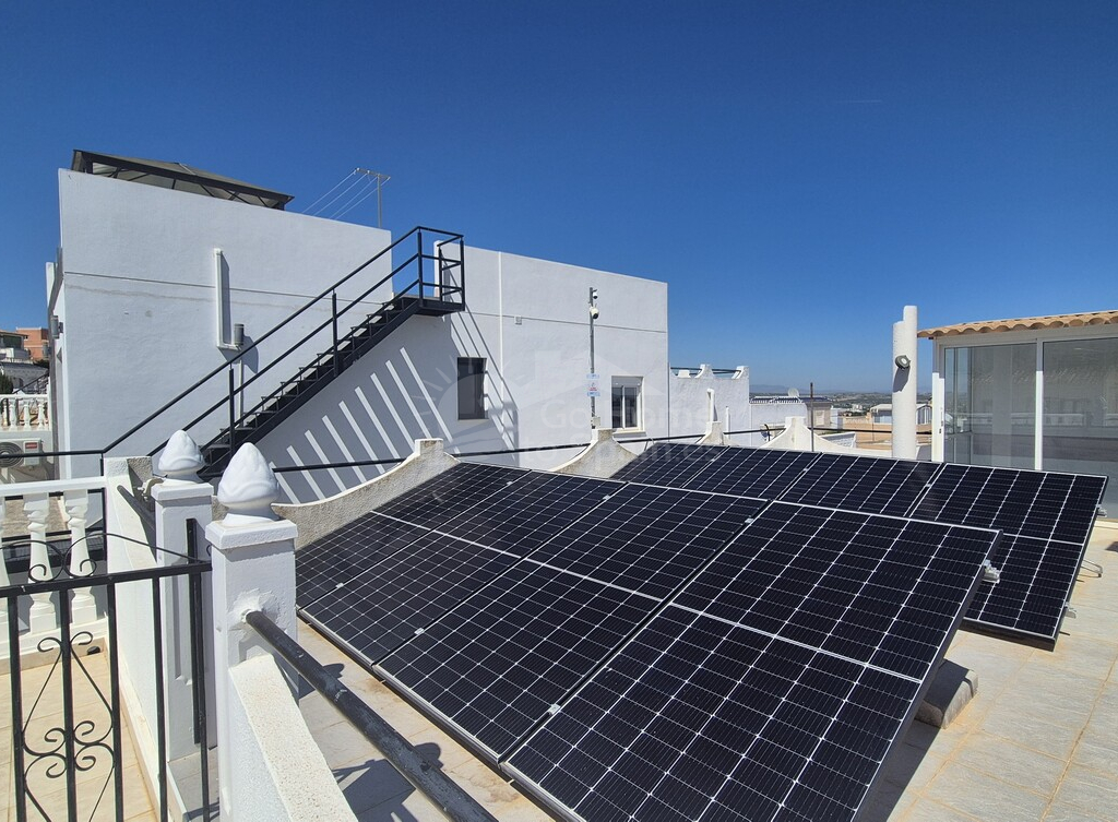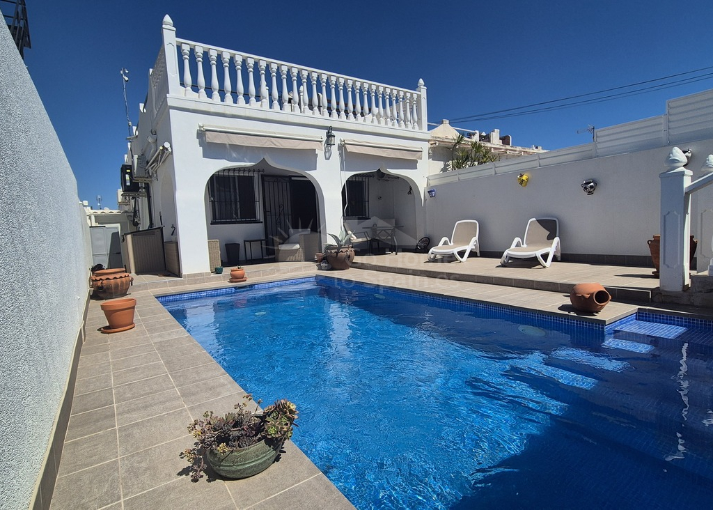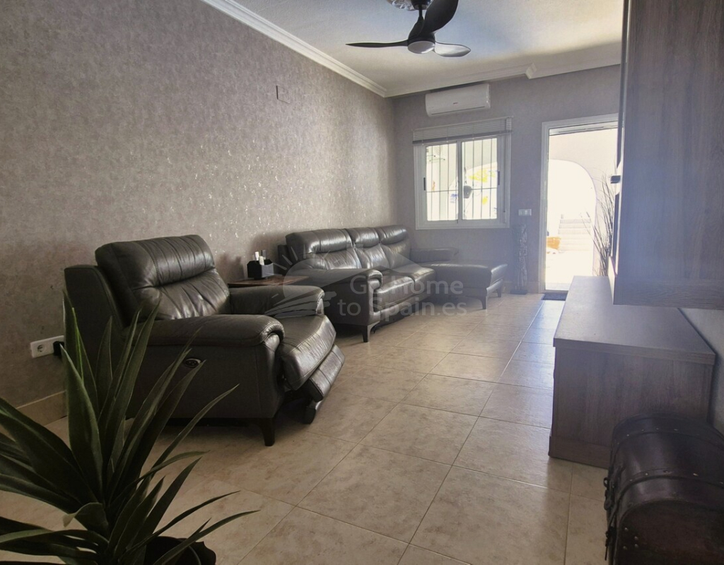 We present you with this impressive 2 bedroom, single-story bungalow, with roof solarium and impressive heated saltwater pool, complemented by solar panels to enhance energy efficiency. Conveniently situated, it is a mere 8 minutes from the bustling Villamartin - 10 minutes to the La Zenia Boulevard area, Beaches, Golf courses, and the popular Zoco Market. The owner has renovated the property over the last two years. The renovation includes:New Metal Fencing to the boundary of the propertyNewly built - HEATED and Covered - SALT WATER Swimming Pool to ensure all year round swimming. The pool has steps entery and a seating area at one end, the full width of of the pool.Newly tiled patio/terraceFreshly painted exterior to the house and boundary wallsNew Gas BoilerSOLAR PANELS – with Solar wallet to supplier and giving free ElectricityRefurbished BathroomRefurbished KitchenInternal walls Plastered to smooth finishNew fitted wardrobe to the main bedroomNew Air-conditioning units running also from wifi if required, allowing you to remotely start on a timer or immediately, from anywhere. Ideal if out and wanting a cool home to return to.New Remote controlled Ceiling FansImagine yourself sitting in the garden of this Beautiful South Facing property, being able to swim, all year round in the Newly Built, Heated Salt water Swimming pool or just simply relaxing on the Terrace.Entering the property, you have a bright spacious lounge and semi open plan to the kitchen which leads onto a utility area, which houses the Washing machine, Dishwasher & Fridge Freezer.The rear stairs lead to the Solarium which currently is home to the Solar Panels. (The Solarium has views to the Salt lakes and offers the potential to be extended to add further bedrooms and bathrooms)There are 2 Large Bright Bedrooms and a refurbished Bathroom.To the side of the property is an external Brick Built Storage area.This Semi Detached property is located in San Miguel De Salinas, which is a multi National community. It is just a 10 minute walk from the Village of San Miguel, which offers Supermarkets, Bars, Restaurants, Shops, Schools and more. There is also a Bar, just at the end of the road of which the Villa is situated.There is a bus service just a 2 minute walk from the house, taking you into La Zenia and also Torrevija (links to the airport). Also a good local Taxi service.Villamartin - GOLF - La Zenia Boulevard and local Beaches & Zoco Market are just a 8- 10 minute drive from the property.Padal Courts, Tennis Courts, Petanque, 5 Min walk from the property. The Village has Community Football pitches & large Community Swimming pool To arrange a Viewing contact us now, before it´s gone! Check out our Property Walk Through Video, get a real feel for this Beautiful Home!