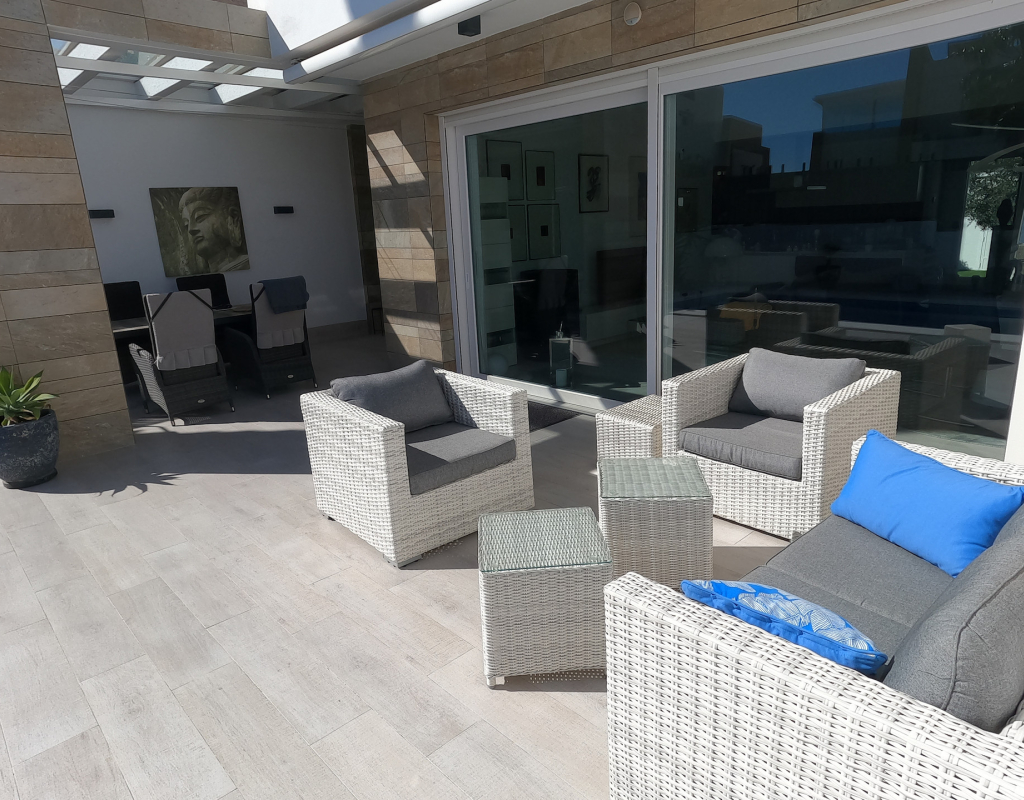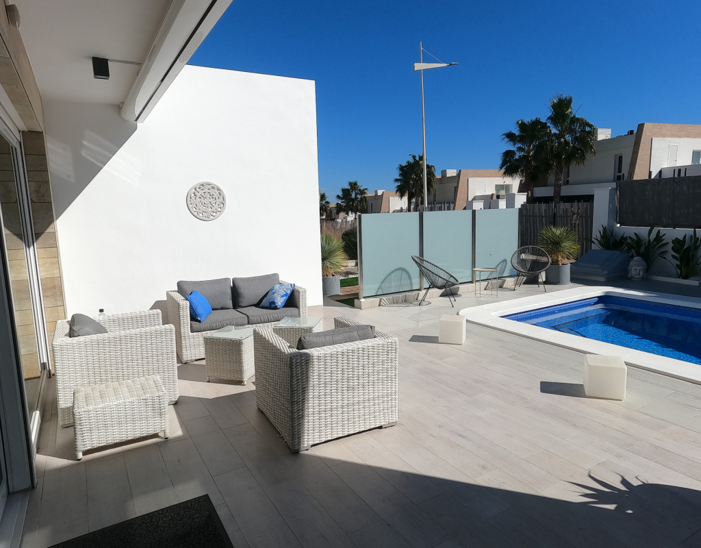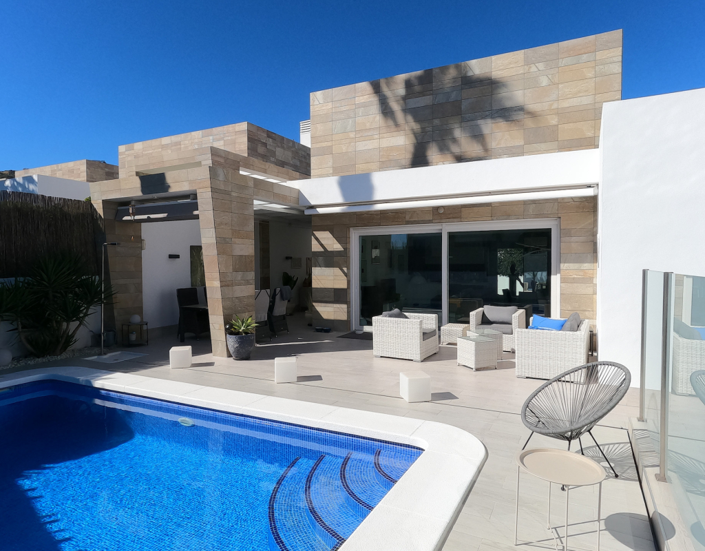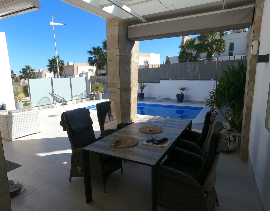 For sale is a spacious detached, south facing villa located in the beautiful area of La Finca Golf, Algorfa, offering a comfortable and private lifestyle. This resale property provides generous internal space, featuring three well-sized bedrooms and two modern bathrooms. The villa is part furnished, and presented in immaculate condition. The villa's south-facing orientation ensures plenty of natural sunlight throughout the day, creating a bright and welcoming atmosphere in every room. Large windows help to capture this light and add to the open feel of the internal space. Extras include: pool, air conditioning, pellet burner, solar panels, storage units, BBQ Algorfa is well known for its tranquil setting, surrounded by lush countryside and orange groves. It offers a peaceful environment while still being conveniently close to various local amenities, including shops, cafes, and leisure facilities. The area is ideal for those who appreciate a relaxed pace of life, with opportunities for outdoor activities such as cycling and golf. The Golf course of La Finca Golf is on the doorstep and within walking distance to the property! This is a fantastic opportunity to own a detached villa in a sought-after location. For more information or to arrange a viewing, please contact OrangeCasas.